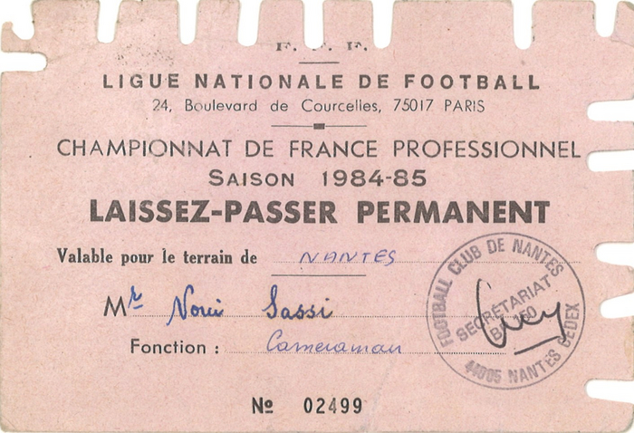 Laisser-passer permanent de Sassi Noui, cameraman du FC Nantes, pour la saison 1984/1985. Ces deux laisser-passer permettent au détenteur d'accéder et de circuler dans le stade les jours de match.