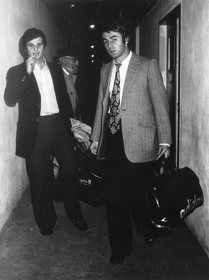 Raynald Denoueix en compagnie de Michel Albaladejo (ancien Nantais et joueur de l'OM), dans les couloirs du stade Marcel Saupin.