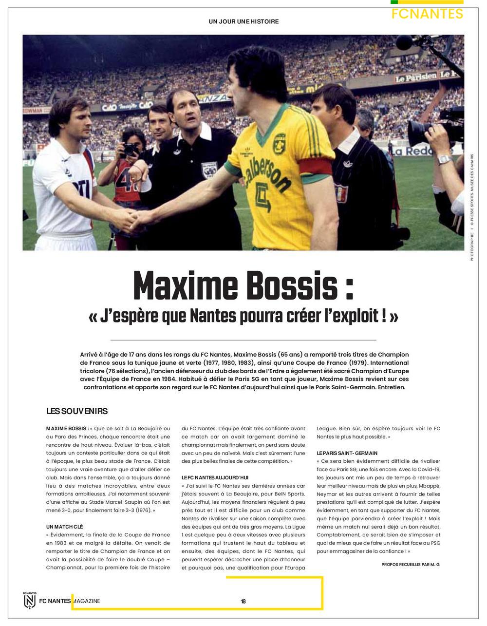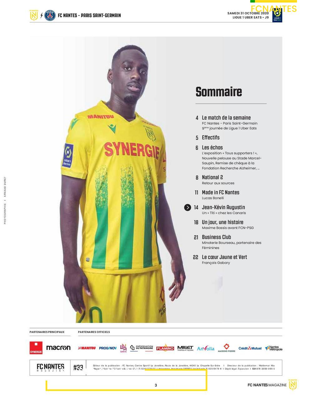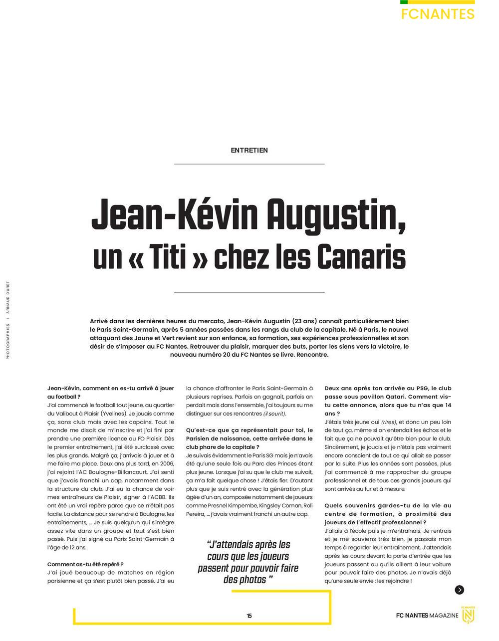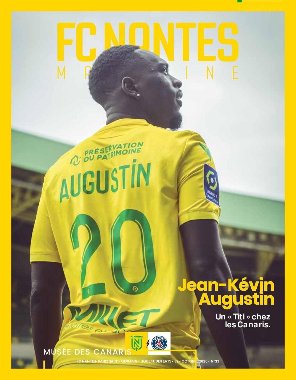 En couverture, Jean Kévin Augustin, ancien du PSG, nouvellement recruté, la formation avec Lucas Bonelli, uen ITW de Maxime Bossis avant le match face au PSG + visuel de la 1ère exposition du Club "Tous Supporters, histoires du FC Nantes".