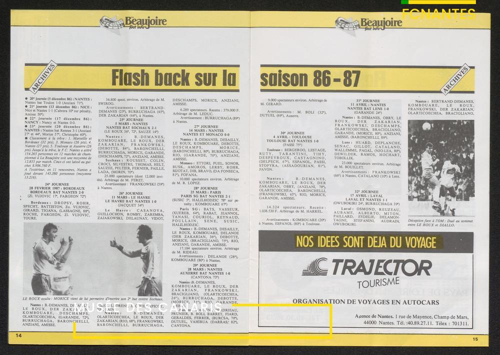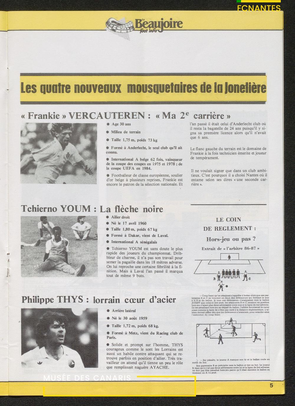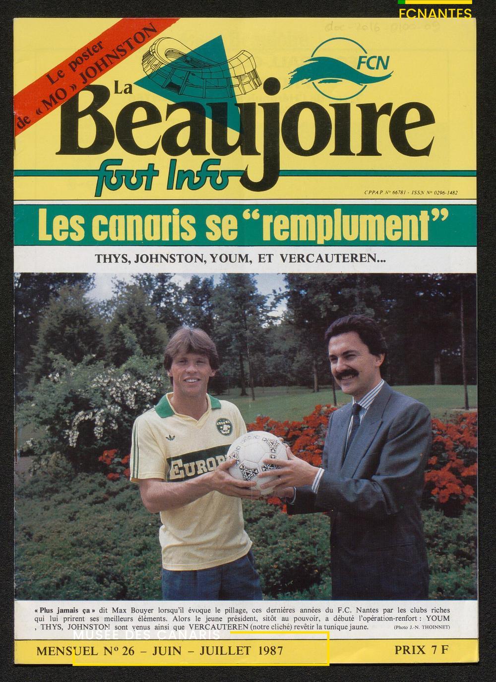 En page de couverture : "Les canaris se remplument" avec la photo du président Max Bouyer et de Franky Vercauteren, nouvelle recrue du Club en 1987.