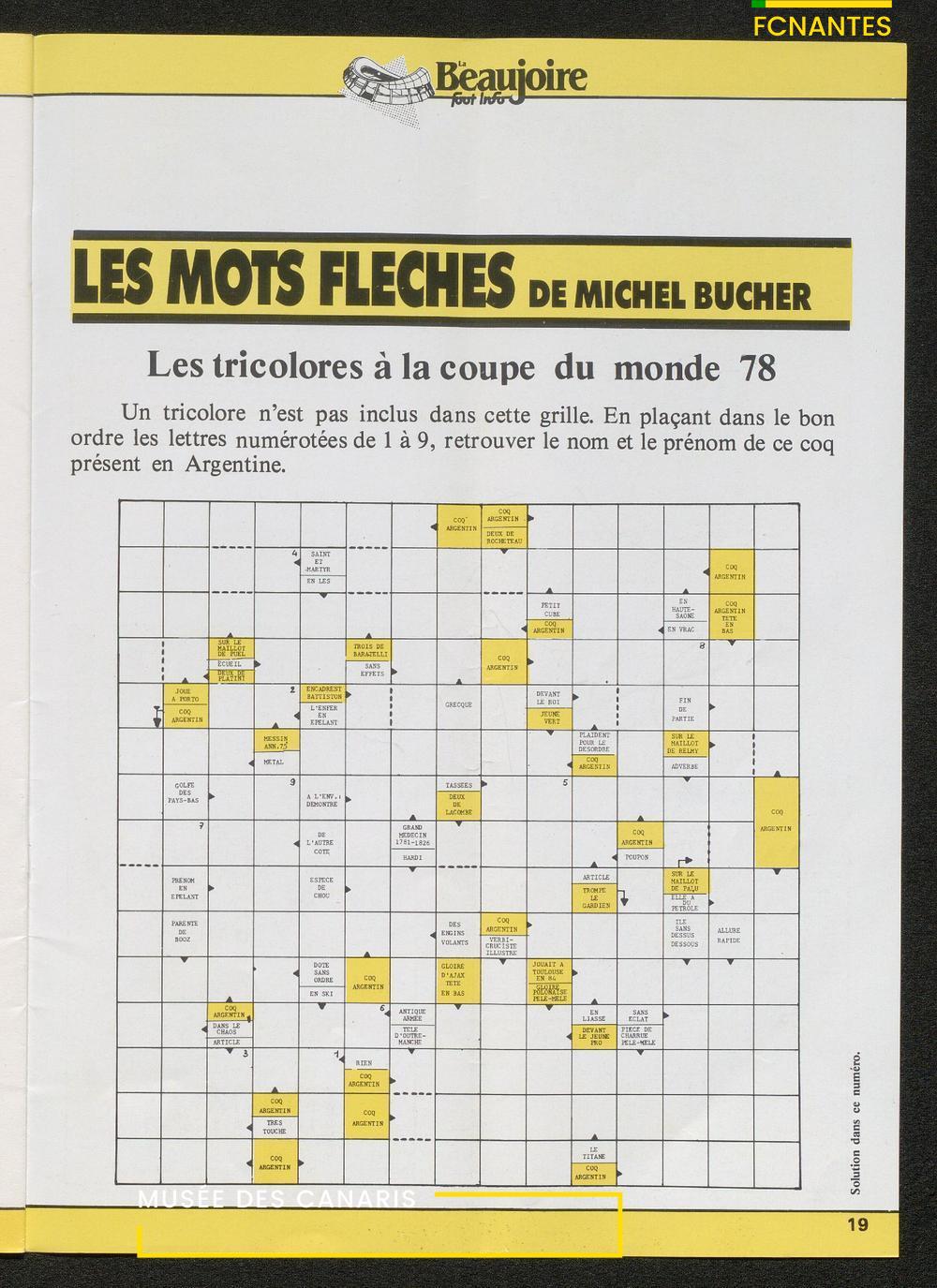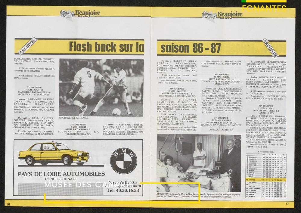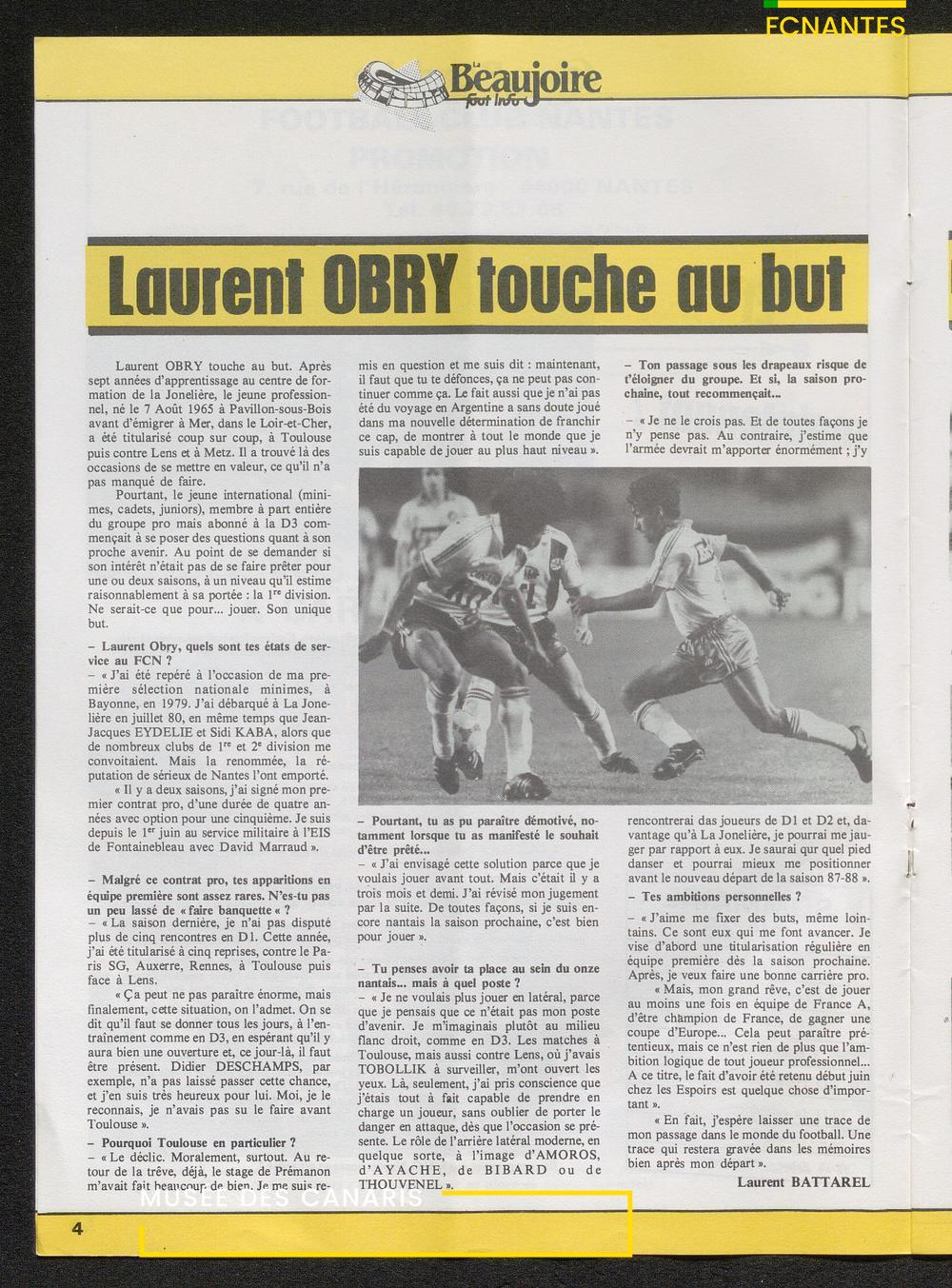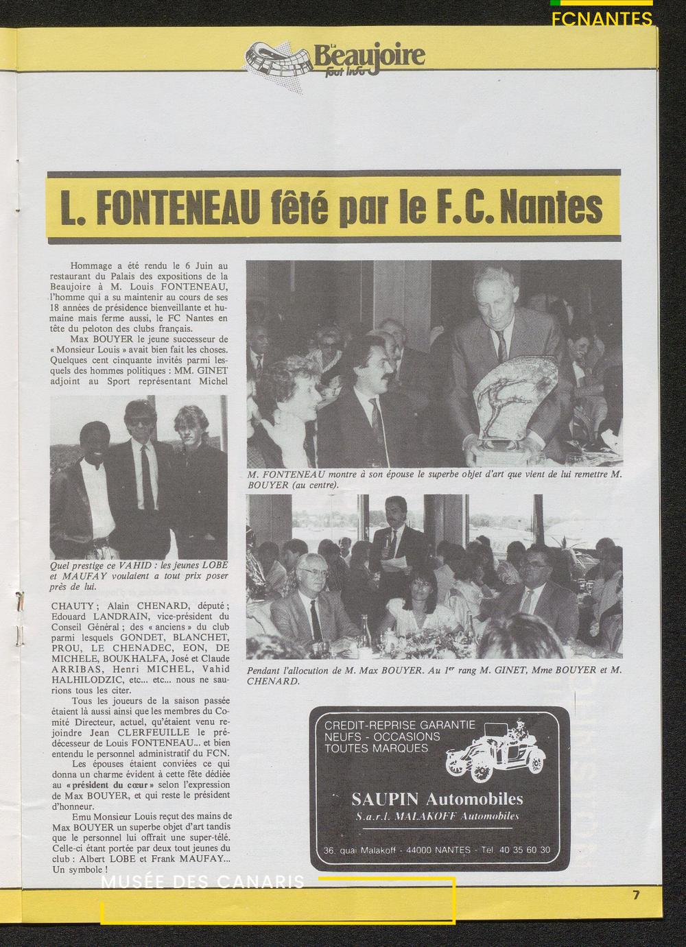 En page de couverture : "Les canaris se remplument" avec la photo du président Max Bouyer et de Franky Vercauteren, nouvelle recrue du Club en 1987.