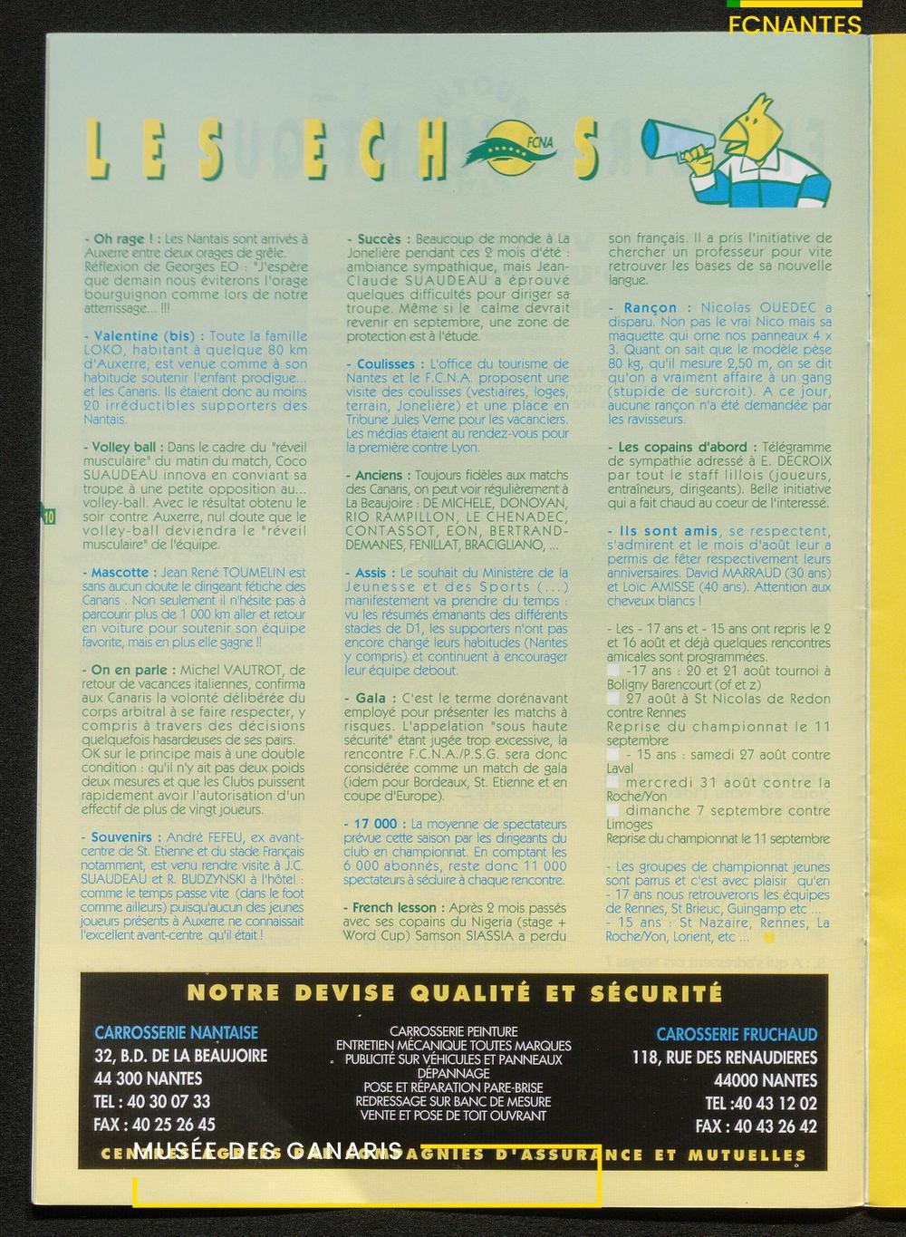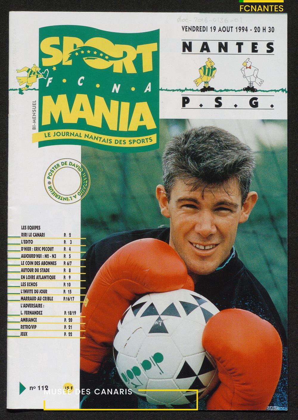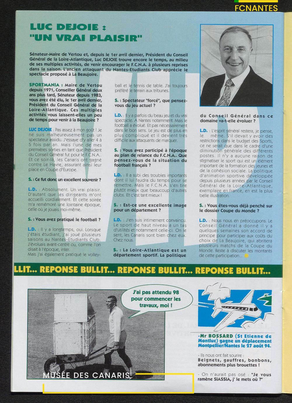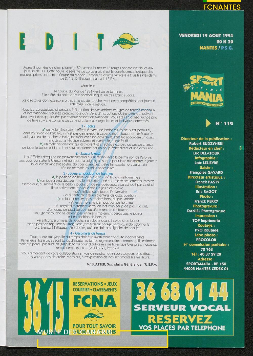Magazine du Club, avant le match Nantes-PSG, du vendredi 19 août 1994 : édito de M. Blatter, président de l'UEFA, David Marraud passé au crible, tour d'horizon de la formation avec Denoueix et Gilles Albert, itw du président du Conseil Général, Luc Dejoie.