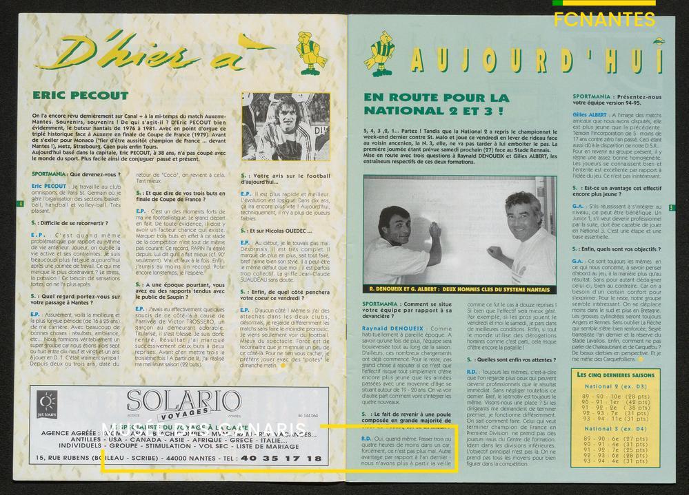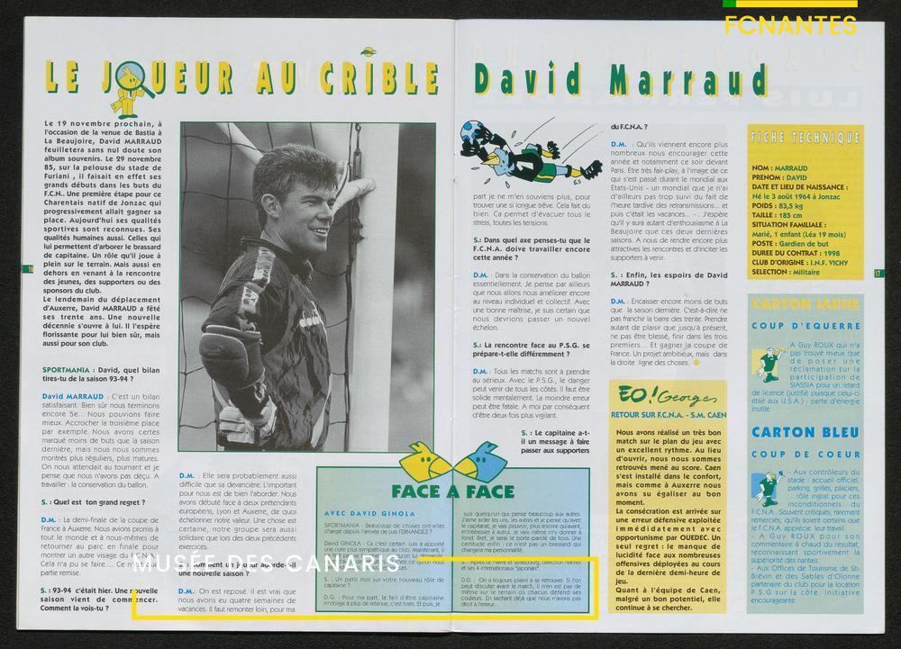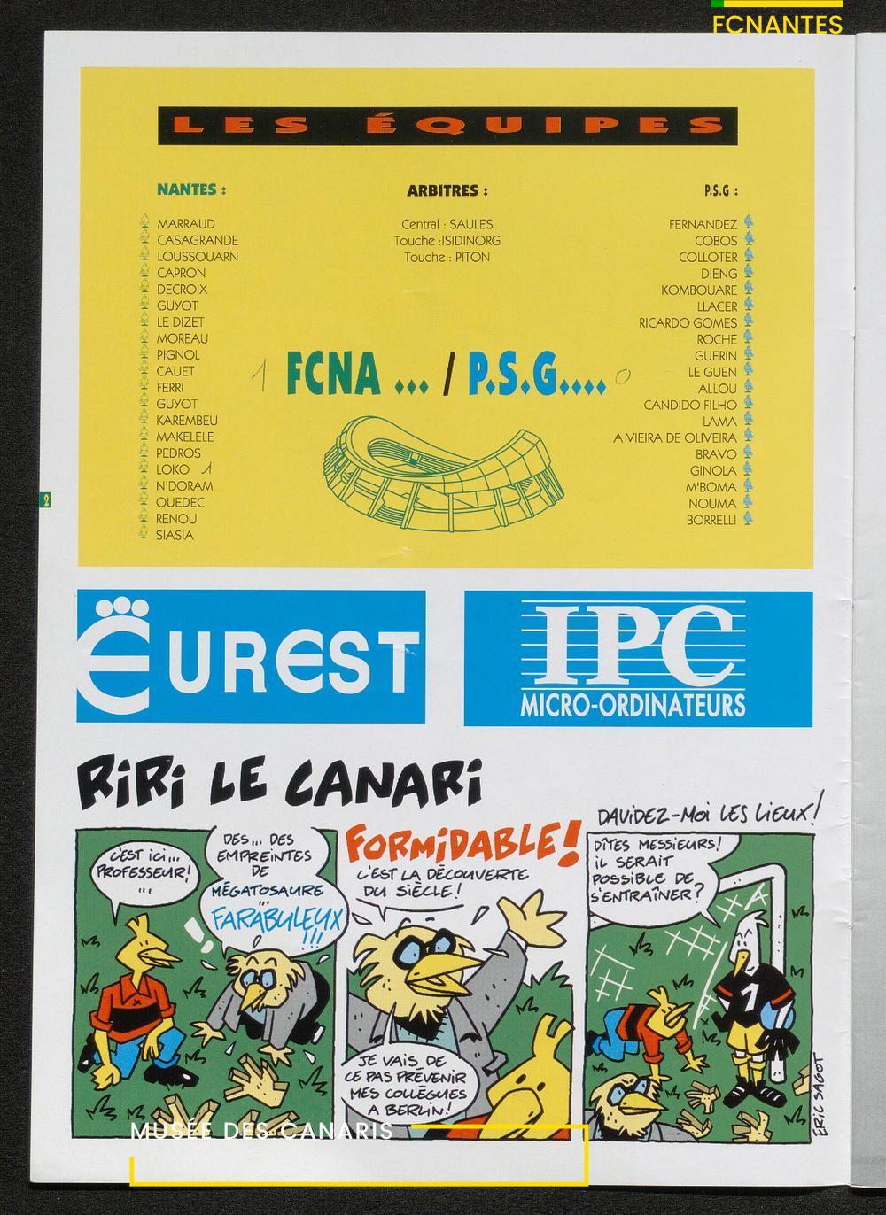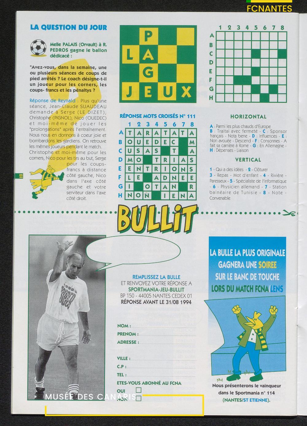 Magazine du Club, avant le match Nantes-PSG, du vendredi 19 août 1994 : édito de M. Blatter, président de l'UEFA, David Marraud passé au crible, tour d'horizon de la formation avec Denoueix et Gilles Albert, itw du président du Conseil Général, Luc Dejoie.