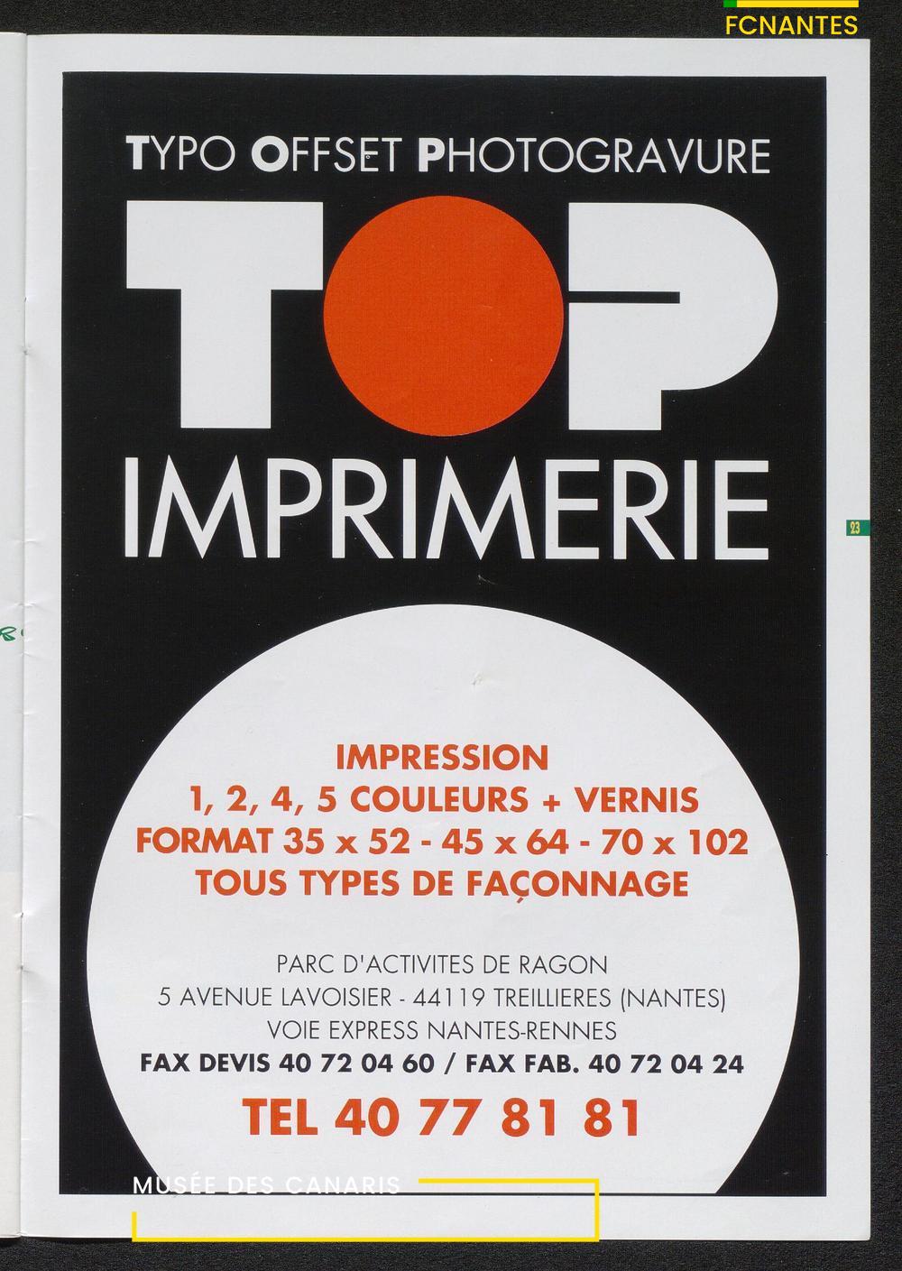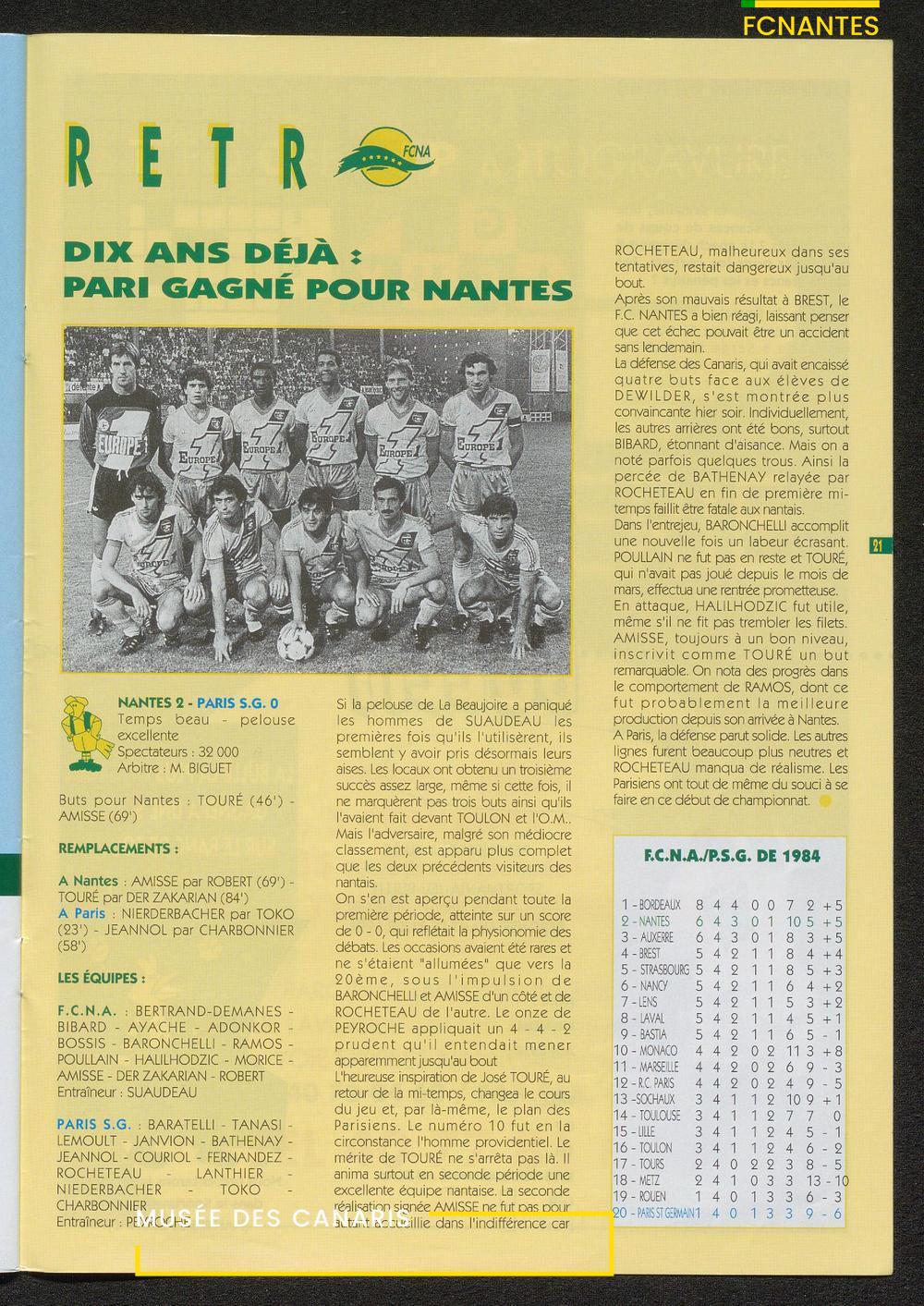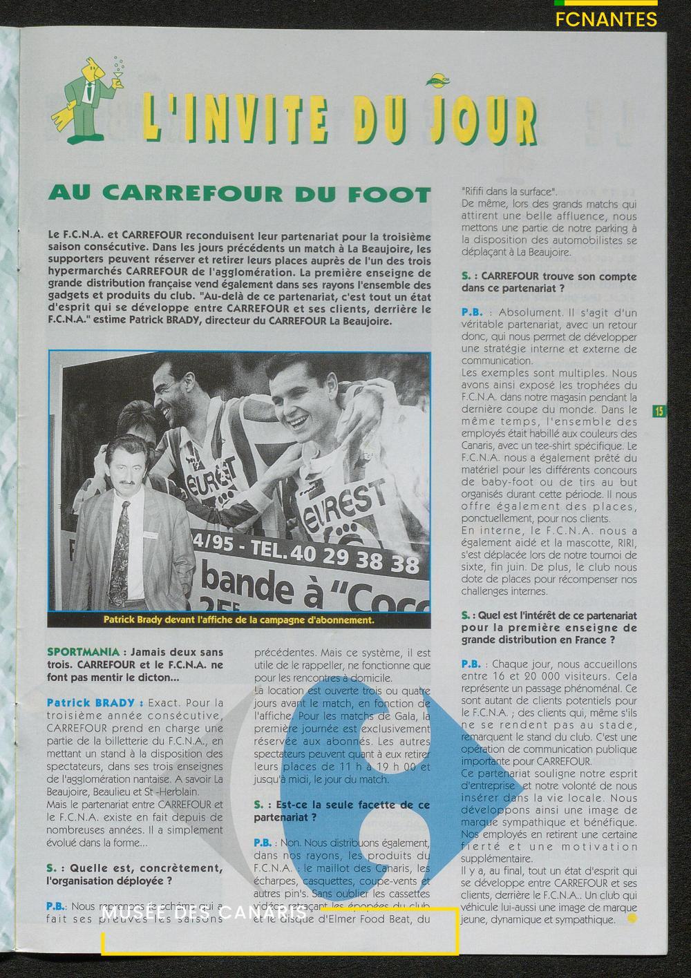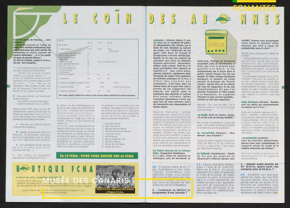 Magazine du Club, avant le match Nantes-PSG, du vendredi 19 août 1994 : édito de M. Blatter, président de l'UEFA, David Marraud passé au crible, tour d'horizon de la formation avec Denoueix et Gilles Albert, itw du président du Conseil Général, Luc Dejoie.