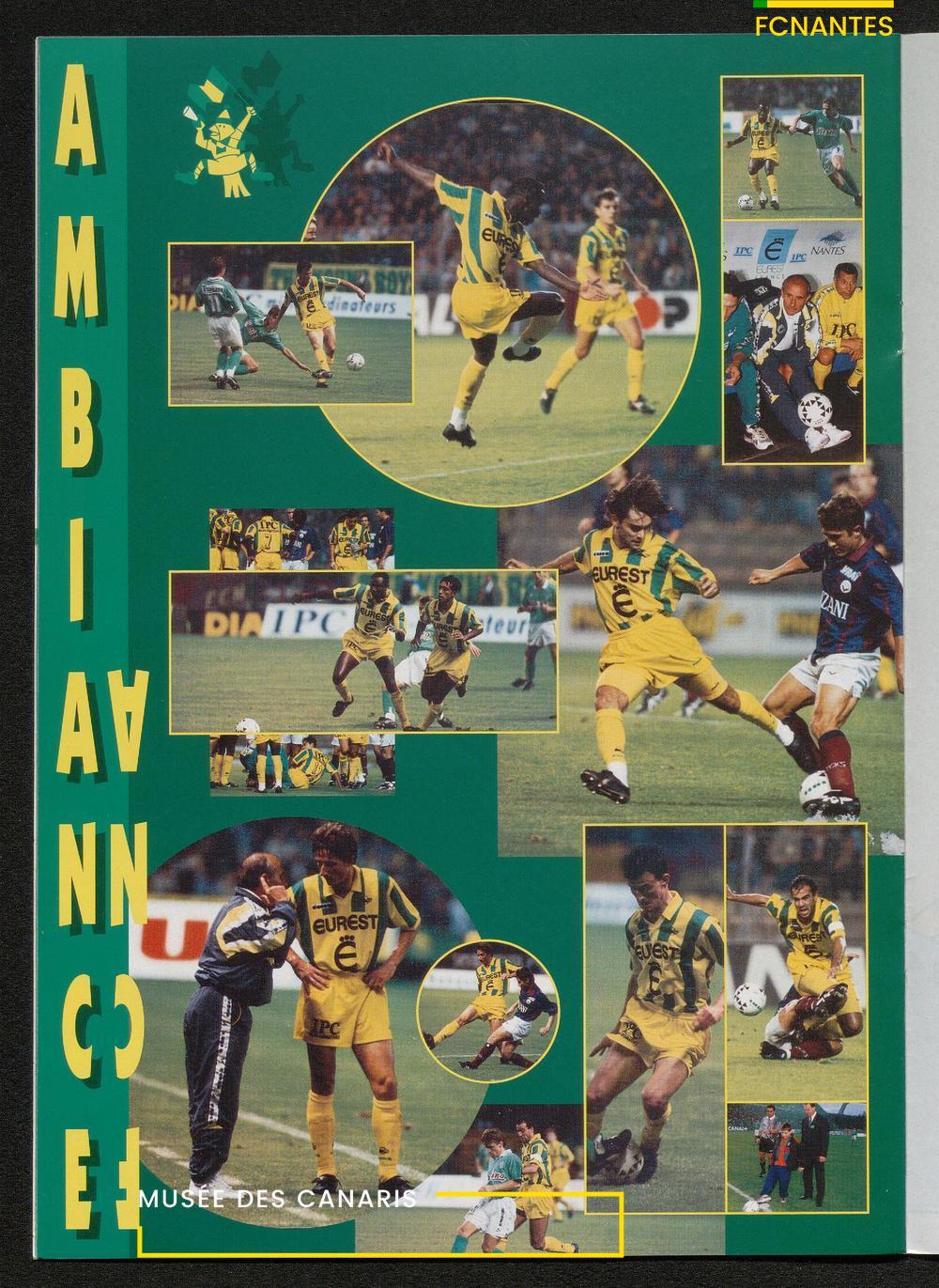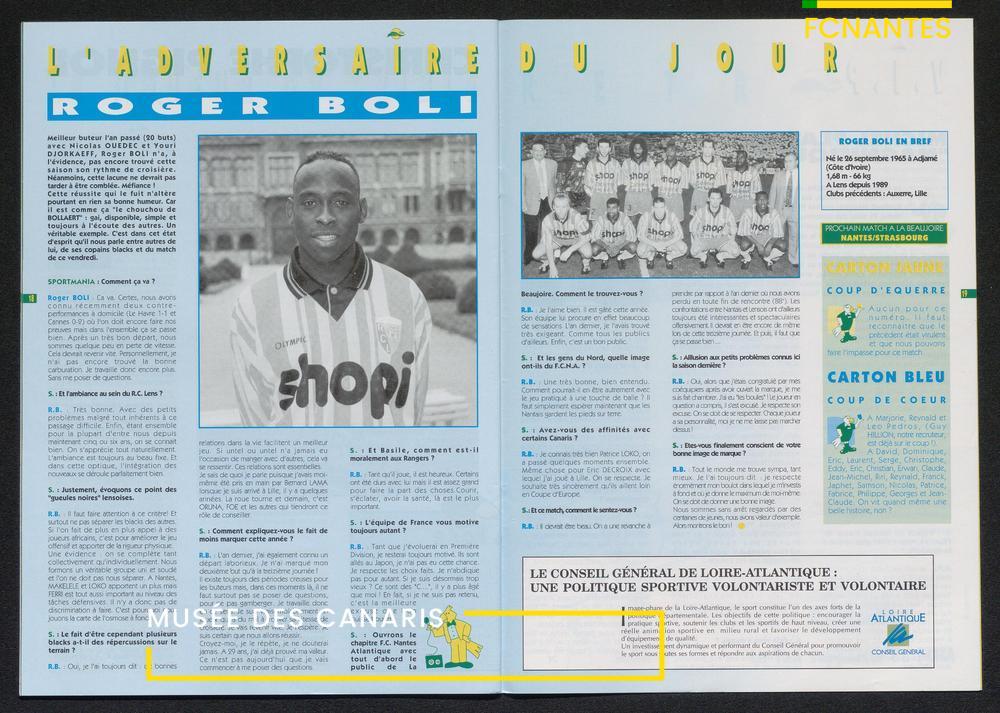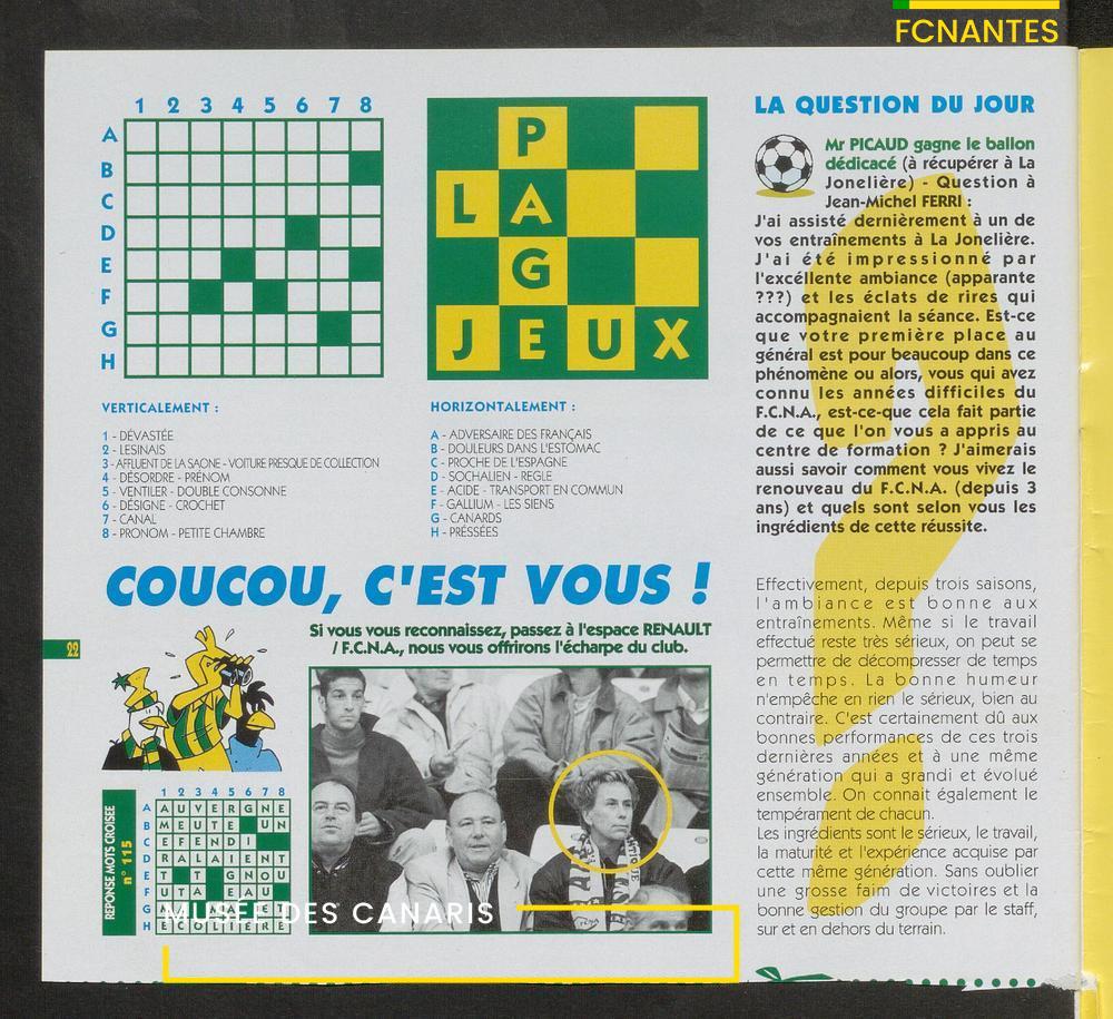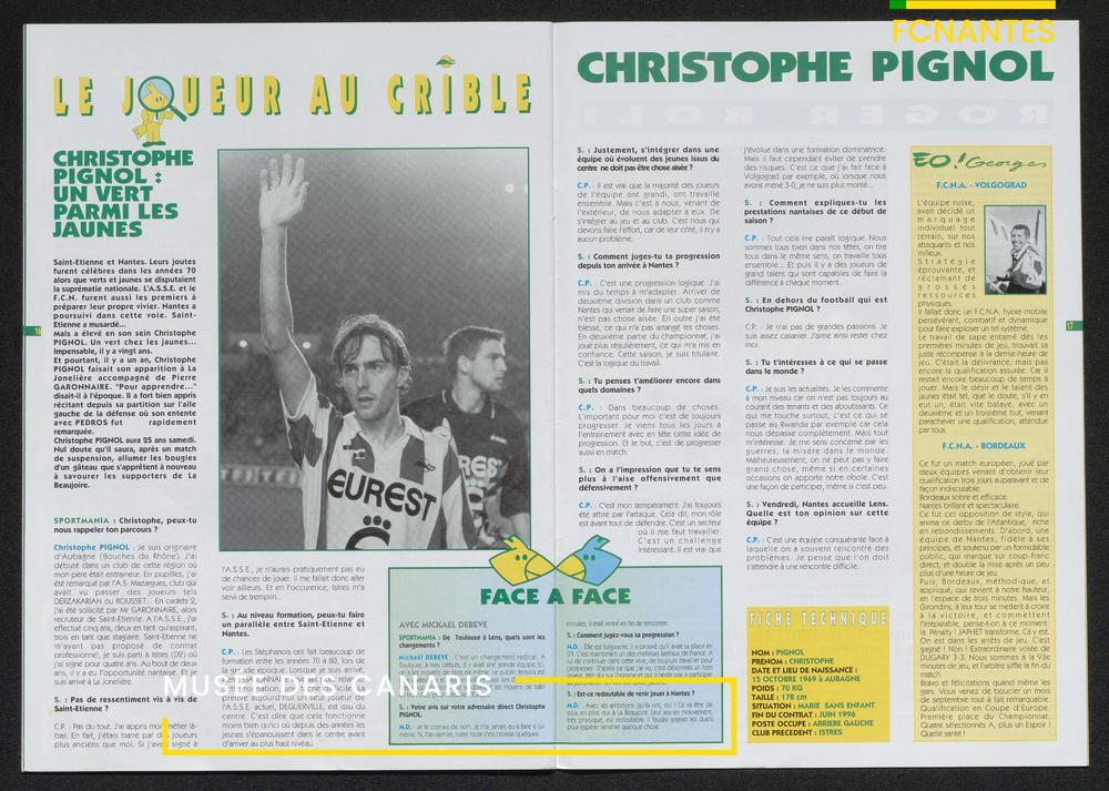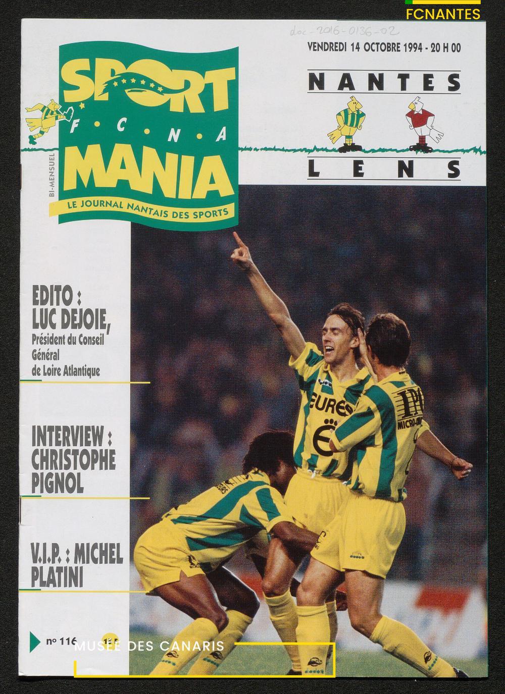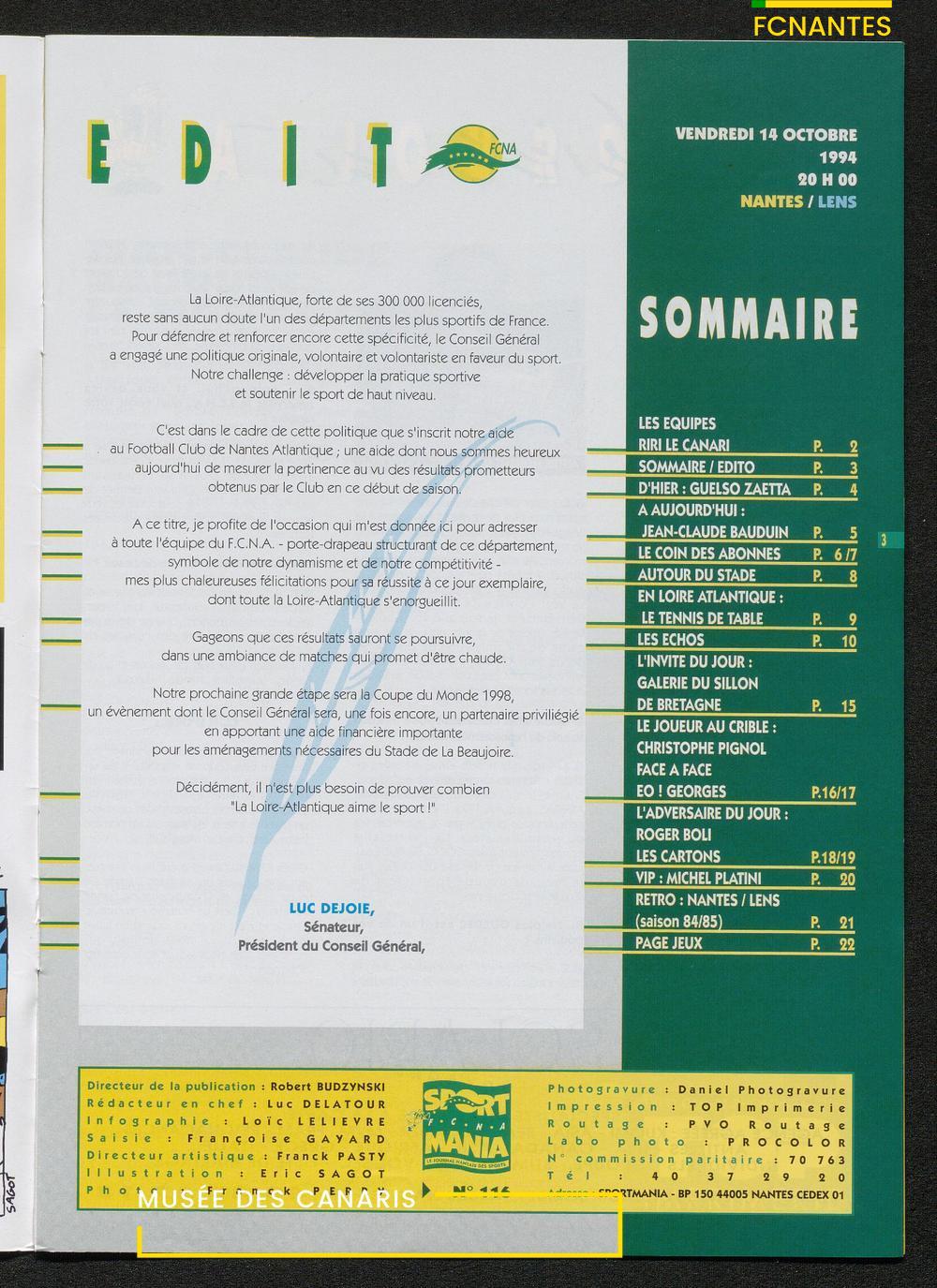 Magazine du Club, avant le match Nantes-Lens, du vendredi 14 octobre 1994 : édito de Luc Dejoie, président du Conseil Général, itw de Christophe Pignol, de Guelso Zaetta, de Jean-Claude Bauduin, de Stella Grimaud (service billetterie) et portrait de Michel Platini.