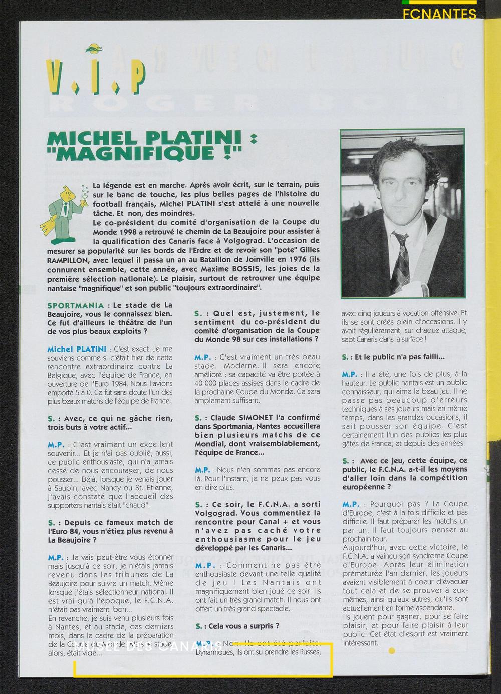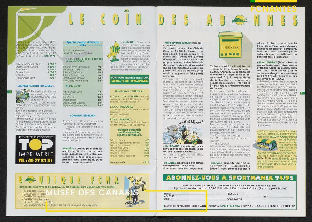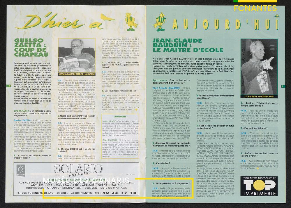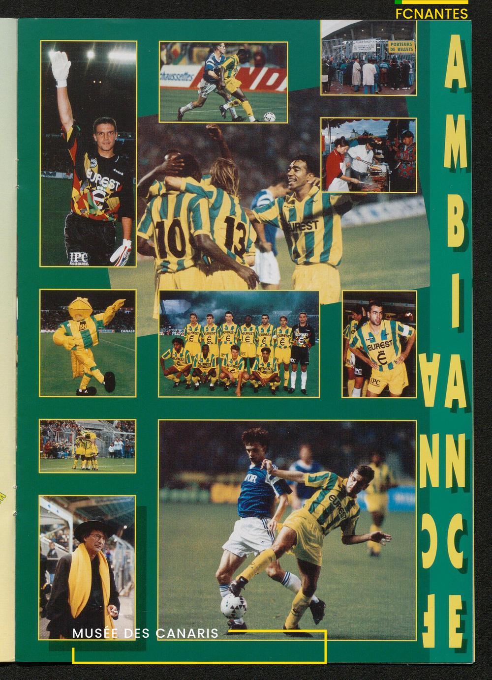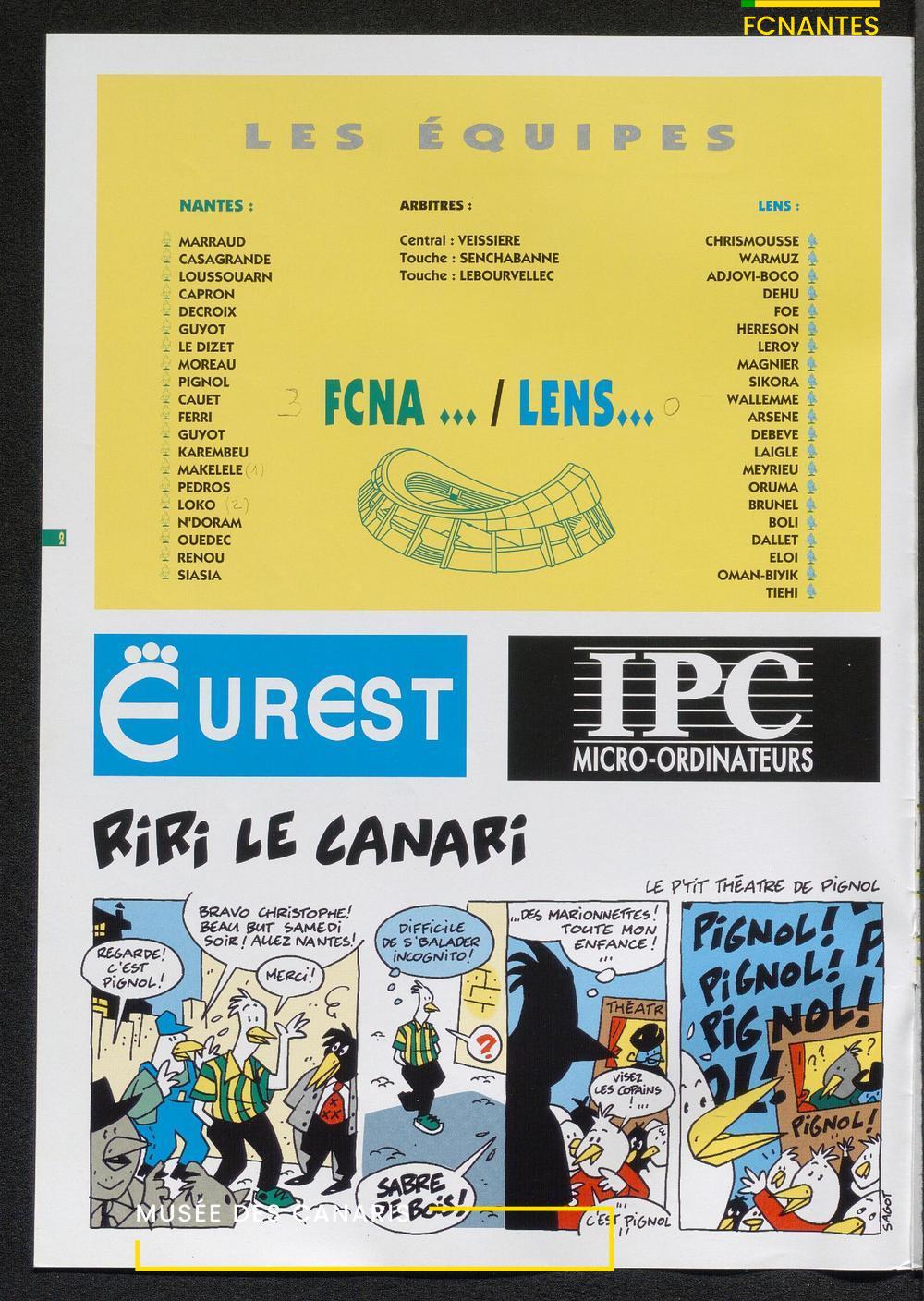 Magazine du Club, avant le match Nantes-Lens, du vendredi 14 octobre 1994 : édito de Luc Dejoie, président du Conseil Général, itw de Christophe Pignol, de Guelso Zaetta, de Jean-Claude Bauduin, de Stella Grimaud (service billetterie) et portrait de Michel Platini.