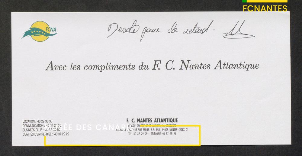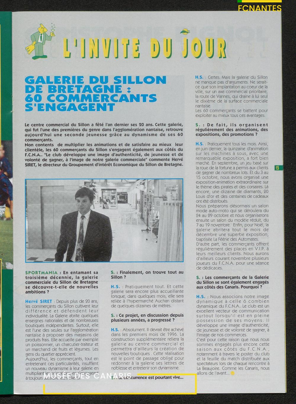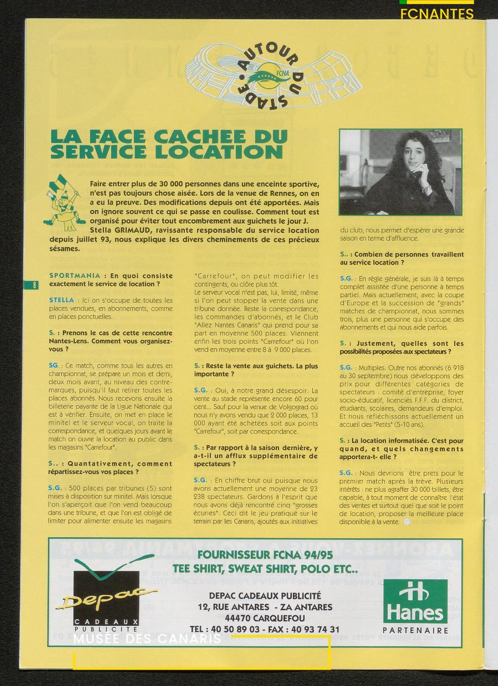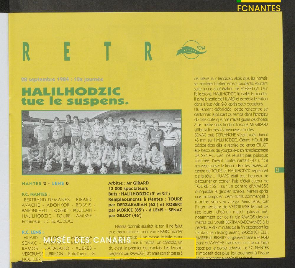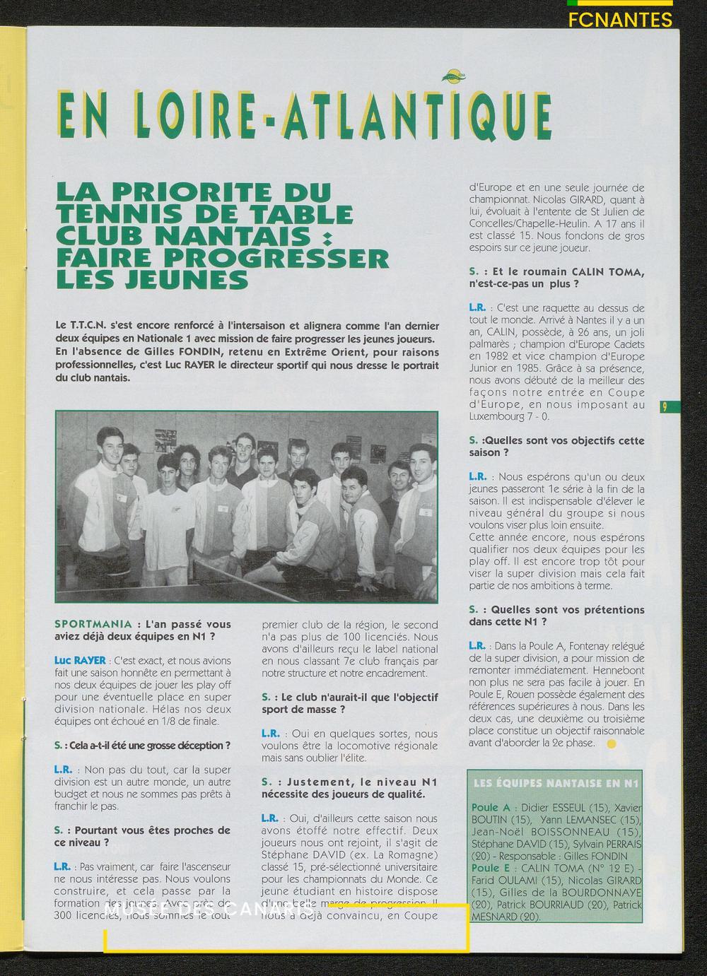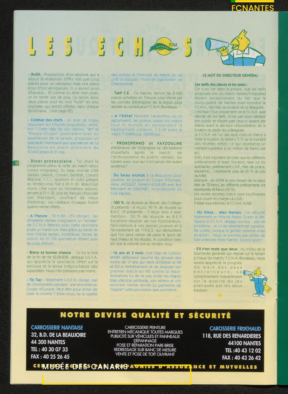 Magazine du Club, avant le match Nantes-Lens, du vendredi 14 octobre 1994 : édito de Luc Dejoie, président du Conseil Général, itw de Christophe Pignol, de Guelso Zaetta, de Jean-Claude Bauduin, de Stella Grimaud (service billetterie) et portrait de Michel Platini.