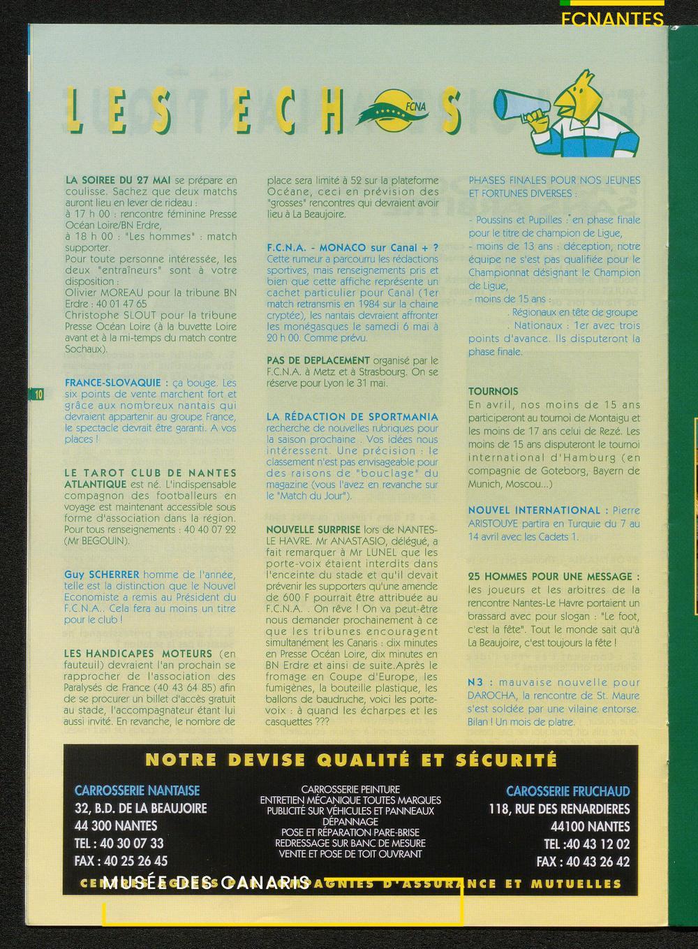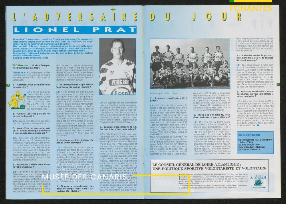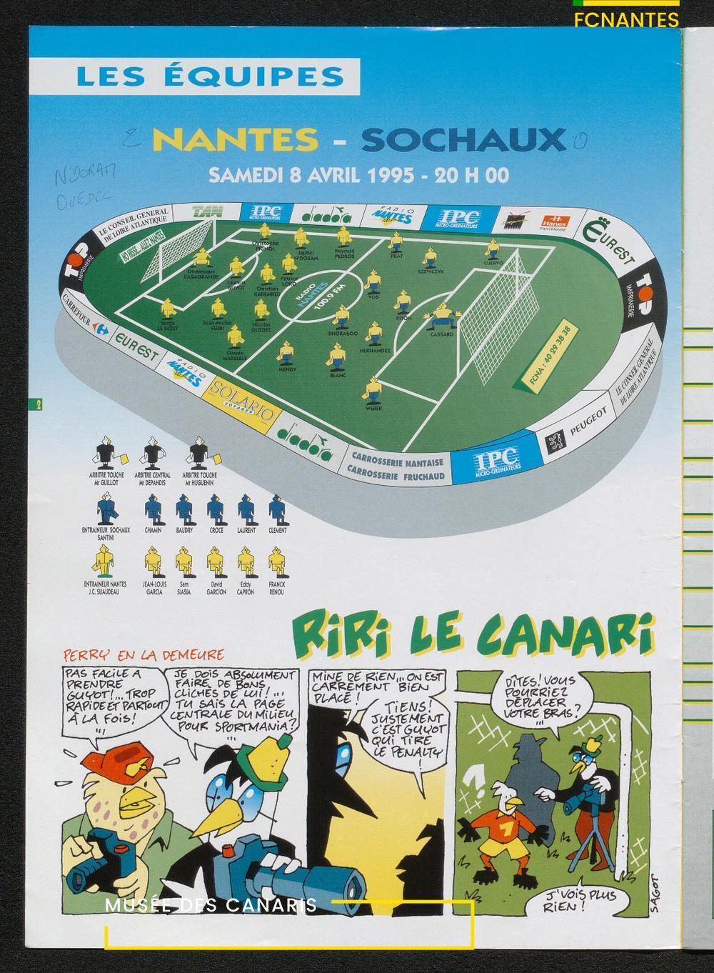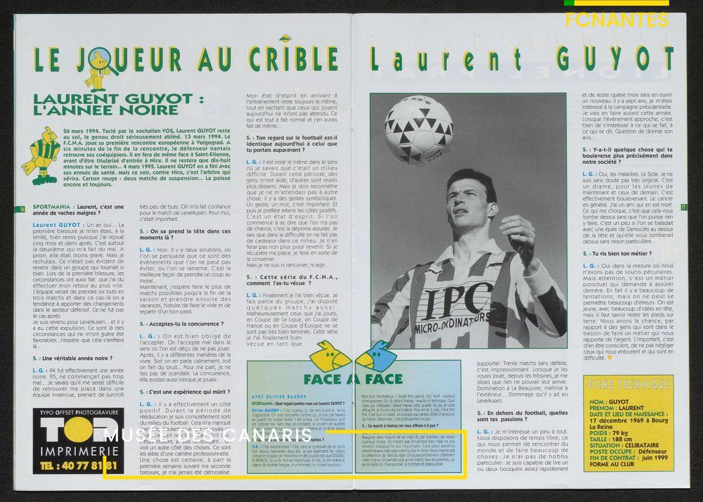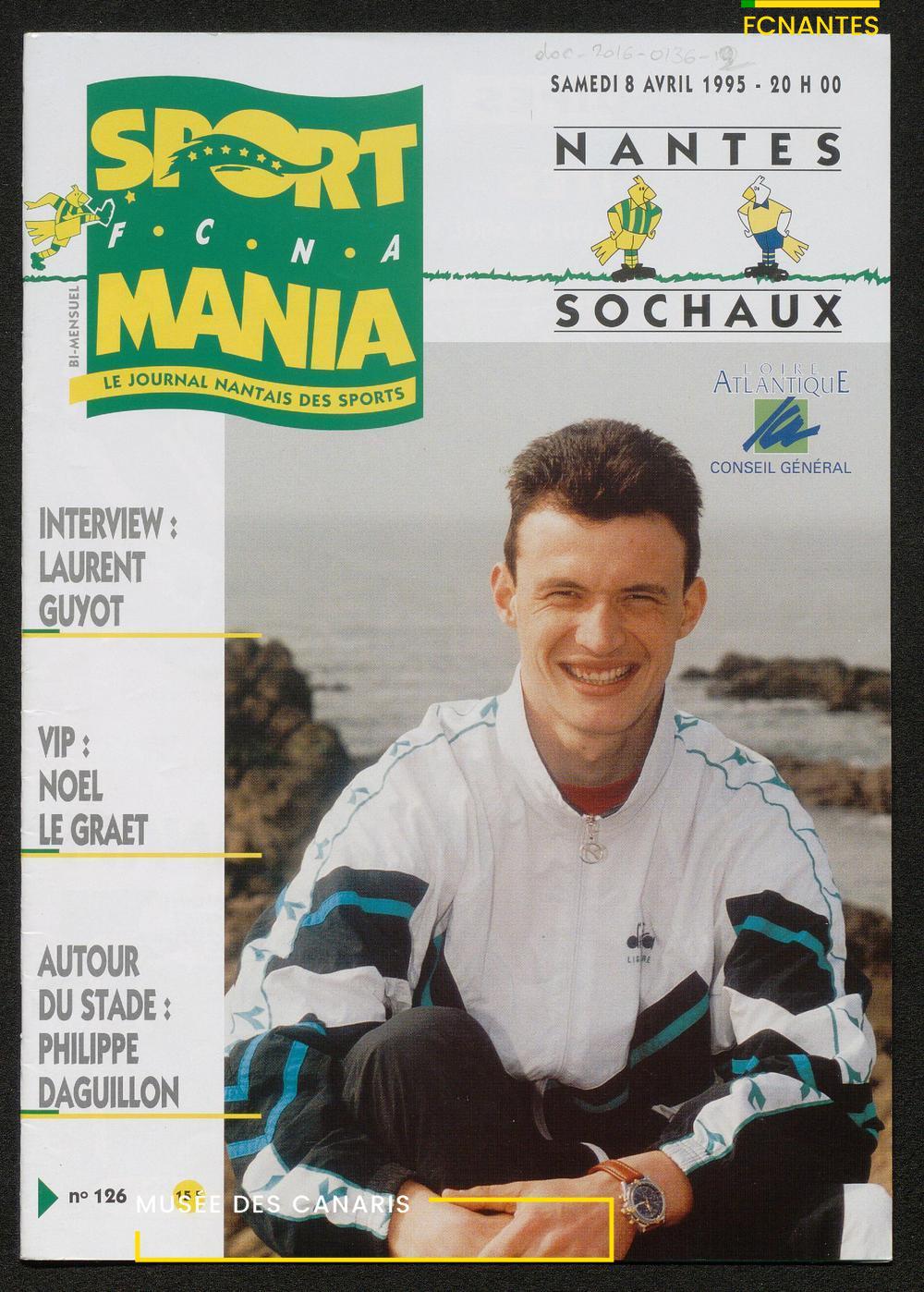 Magazine du Club, avant le match Nantes-Sochaux, le samedi 8 avril 1995 : rencontres avec Laurent Guyot, Noël Le Graët, Philippe Daguillon, Jean-Louis Lima et un sujet sur l'arbitrage avec Patrick Denis.