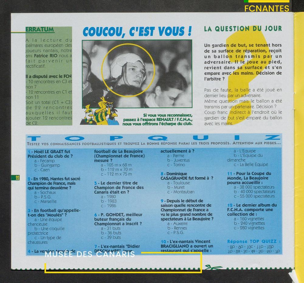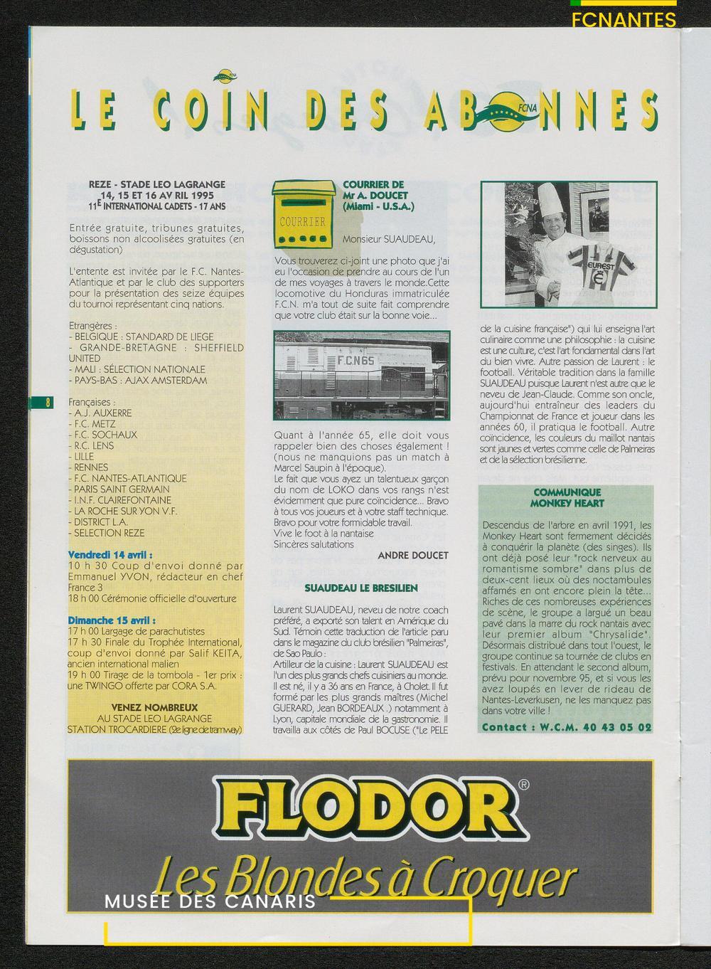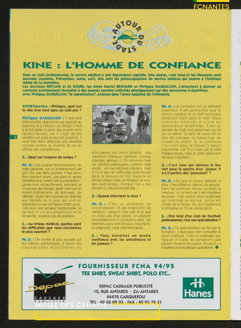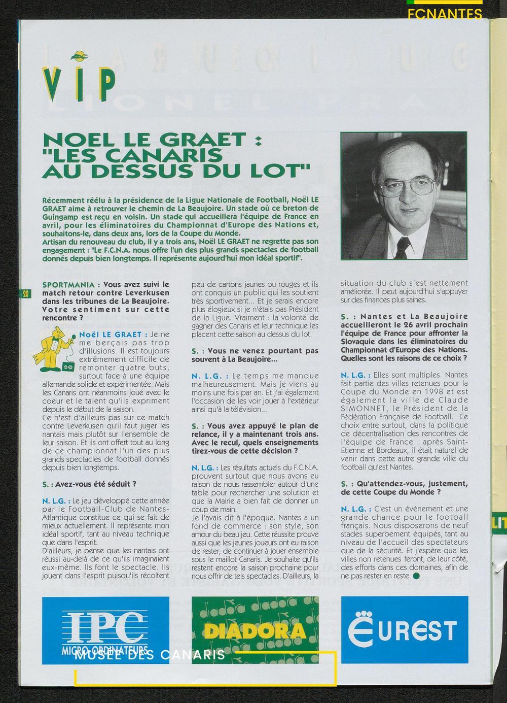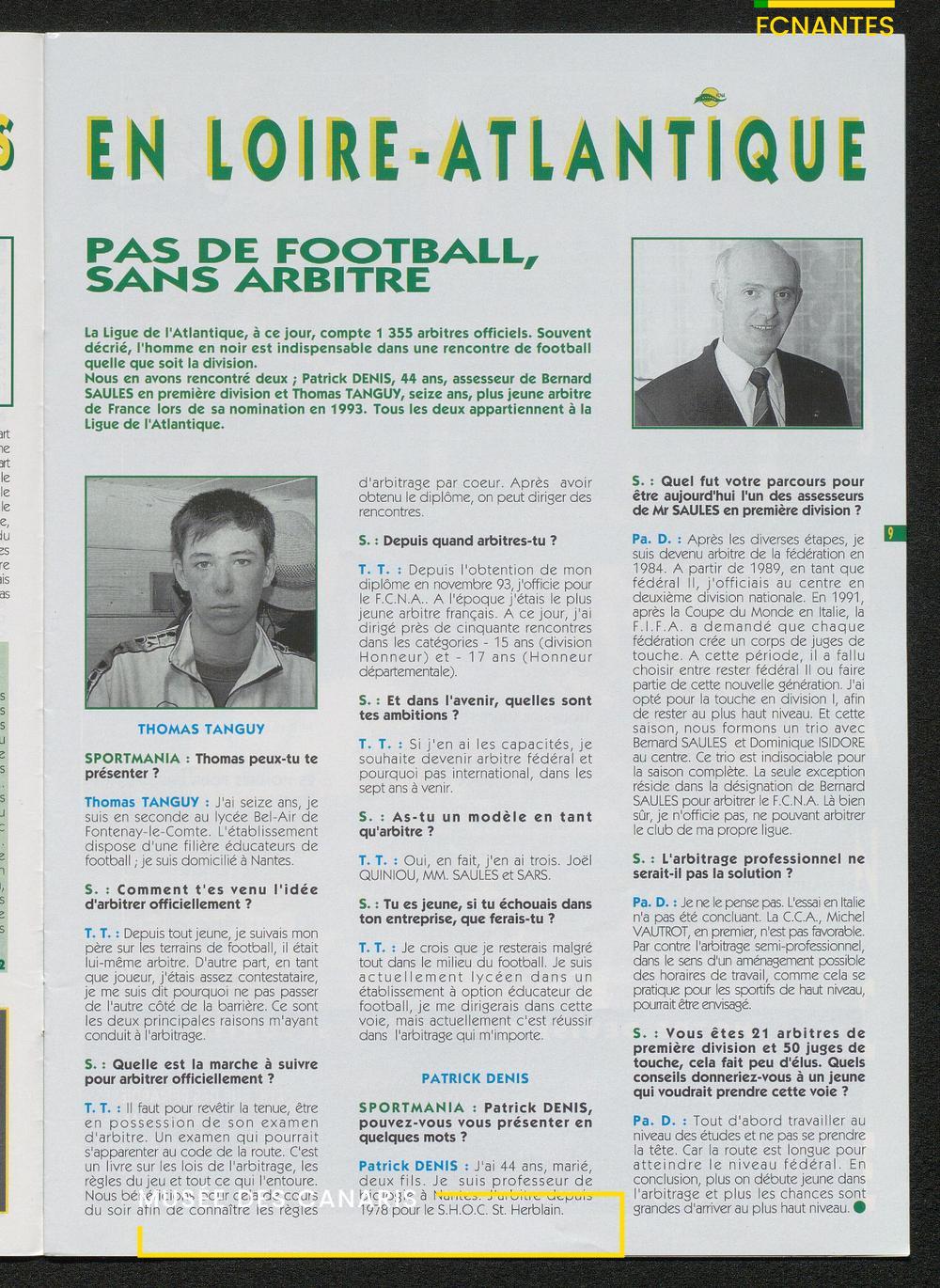 Magazine du Club, avant le match Nantes-Sochaux, le samedi 8 avril 1995 : rencontres avec Laurent Guyot, Noël Le Graët, Philippe Daguillon, Jean-Louis Lima et un sujet sur l'arbitrage avec Patrick Denis.