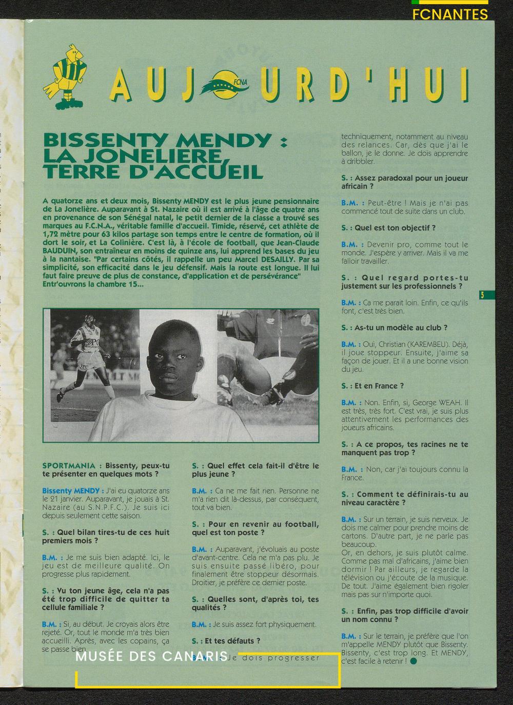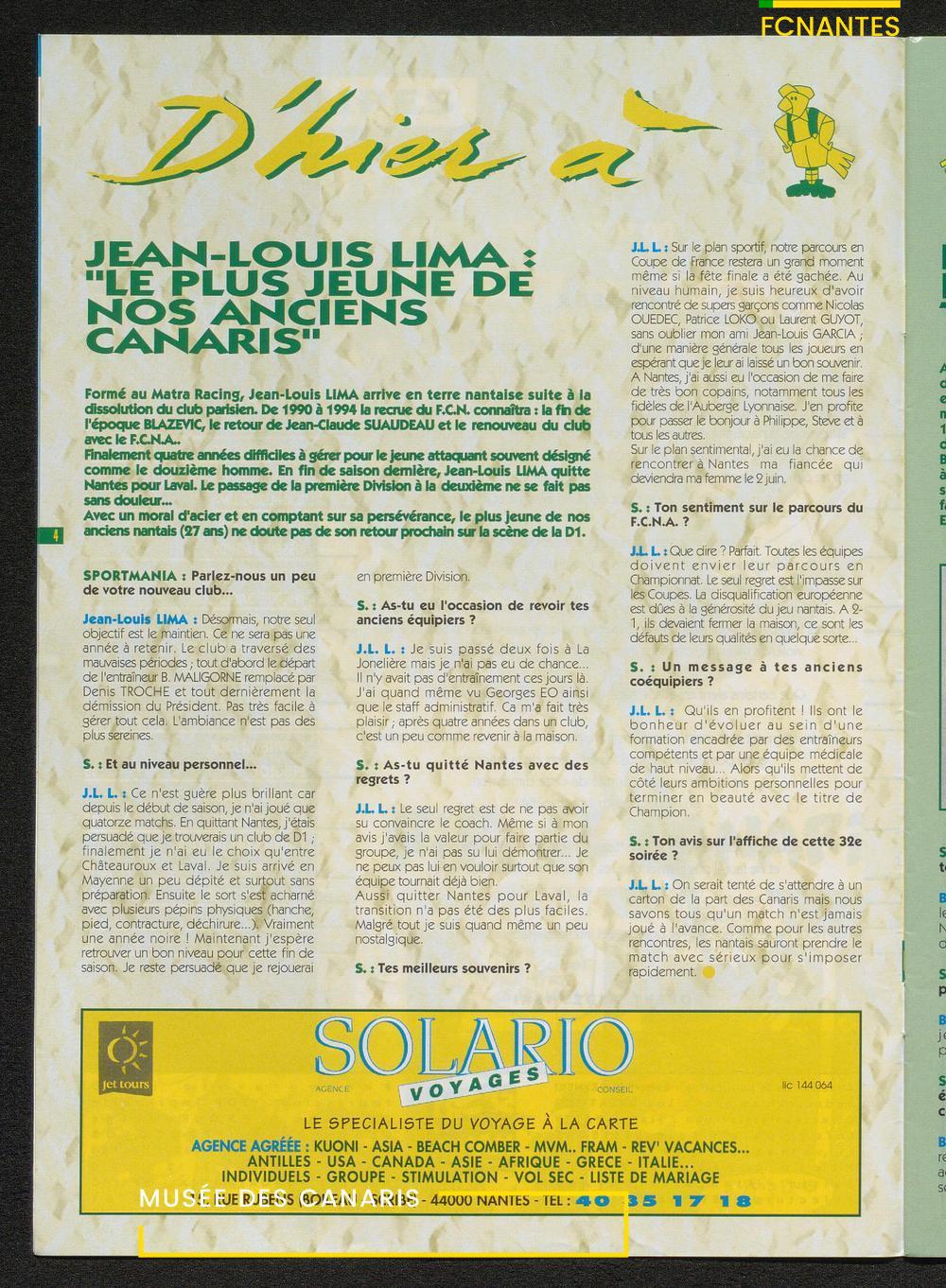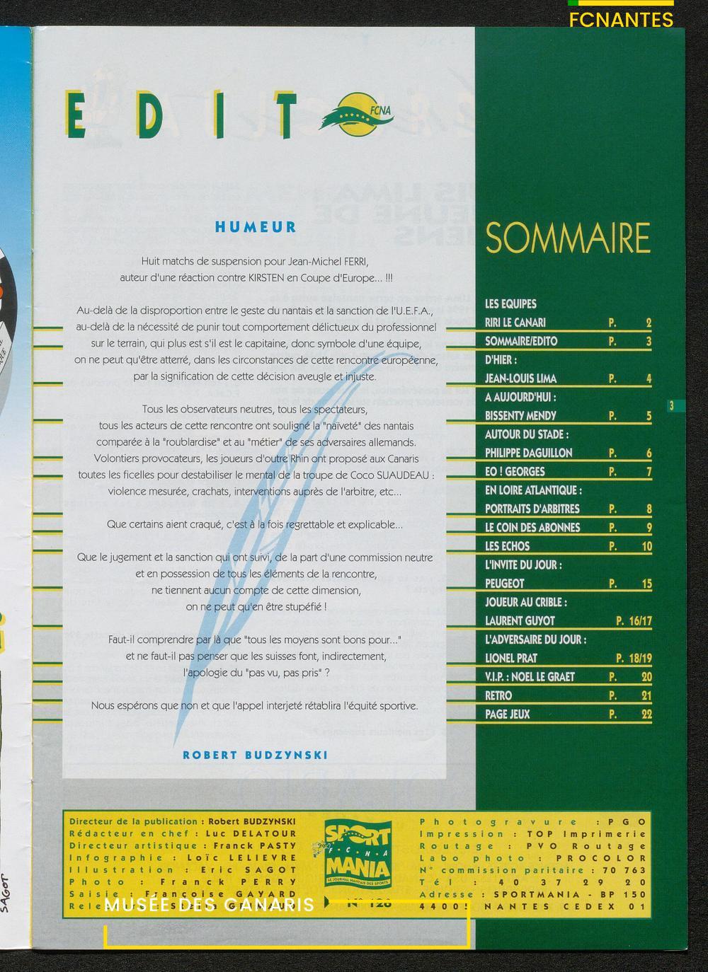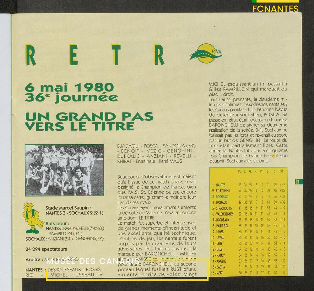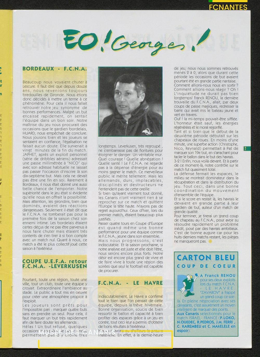 Magazine du Club, avant le match Nantes-Sochaux, le samedi 8 avril 1995 : rencontres avec Laurent Guyot, Noël Le Graët, Philippe Daguillon, Jean-Louis Lima et un sujet sur l'arbitrage avec Patrick Denis.