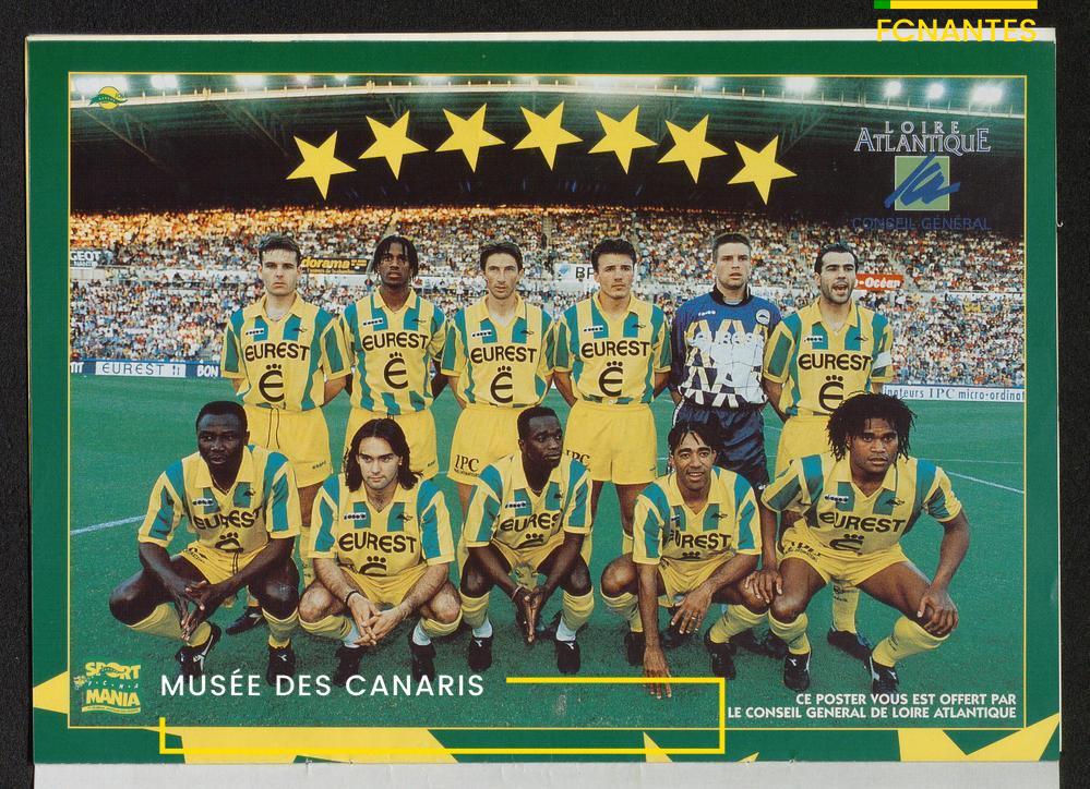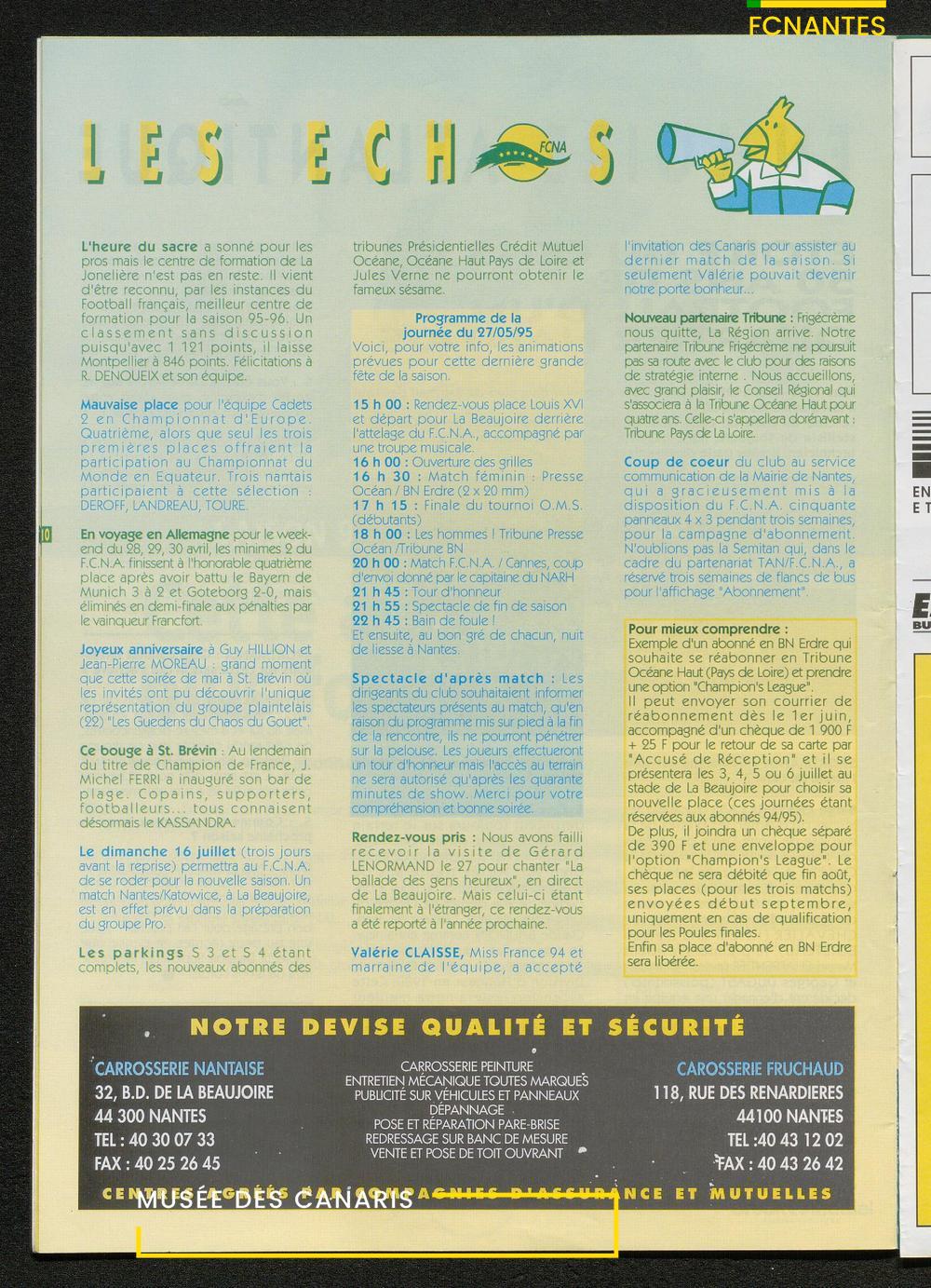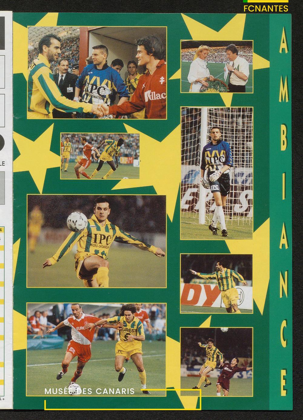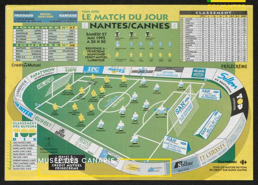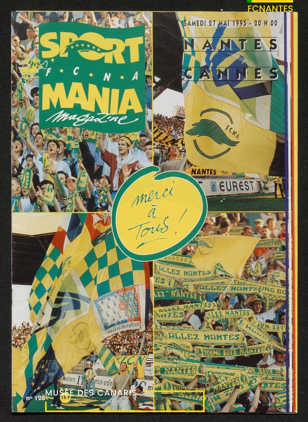 Magazine du Club, avant le match Nantes/Cannes, le samedi 27 mai 1995, n°128 : "Place à la fête !", les Canaris jouent pour fêter leur 7ème étoile, avec des itw de Deschamps, Eo, Scherrer, Suaudeau et Patrick Viera (Cannes).