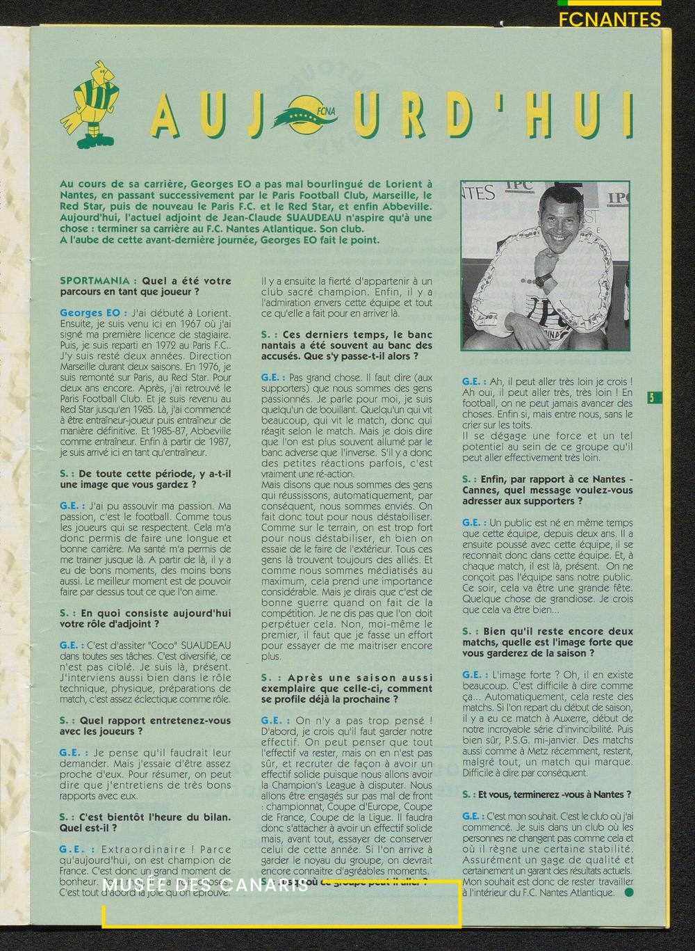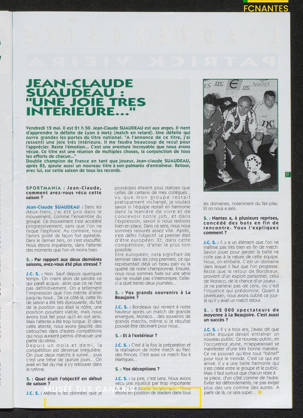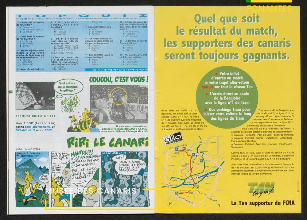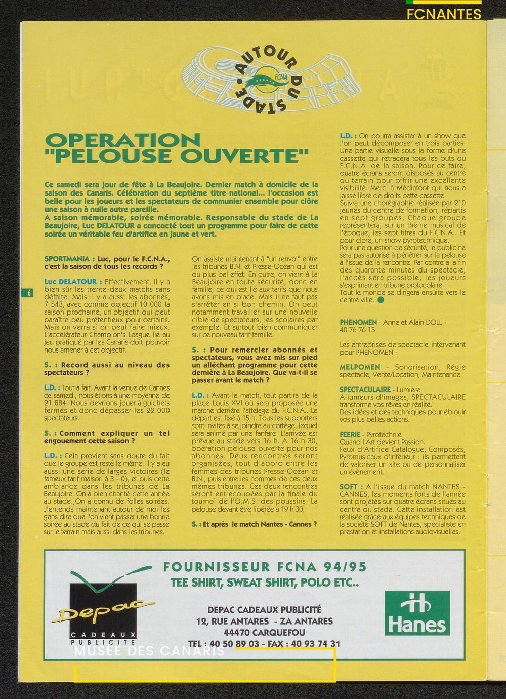 Magazine du Club, avant le match Nantes/Cannes, le samedi 27 mai 1995, n°128 : "Place à la fête !", les Canaris jouent pour fêter leur 7ème étoile, avec des itw de Deschamps, Eo, Scherrer, Suaudeau et Patrick Viera (Cannes).