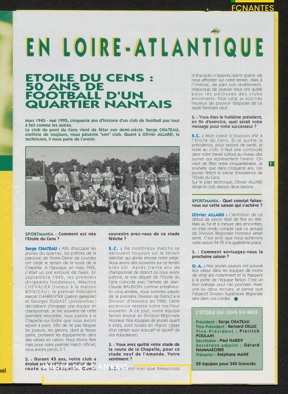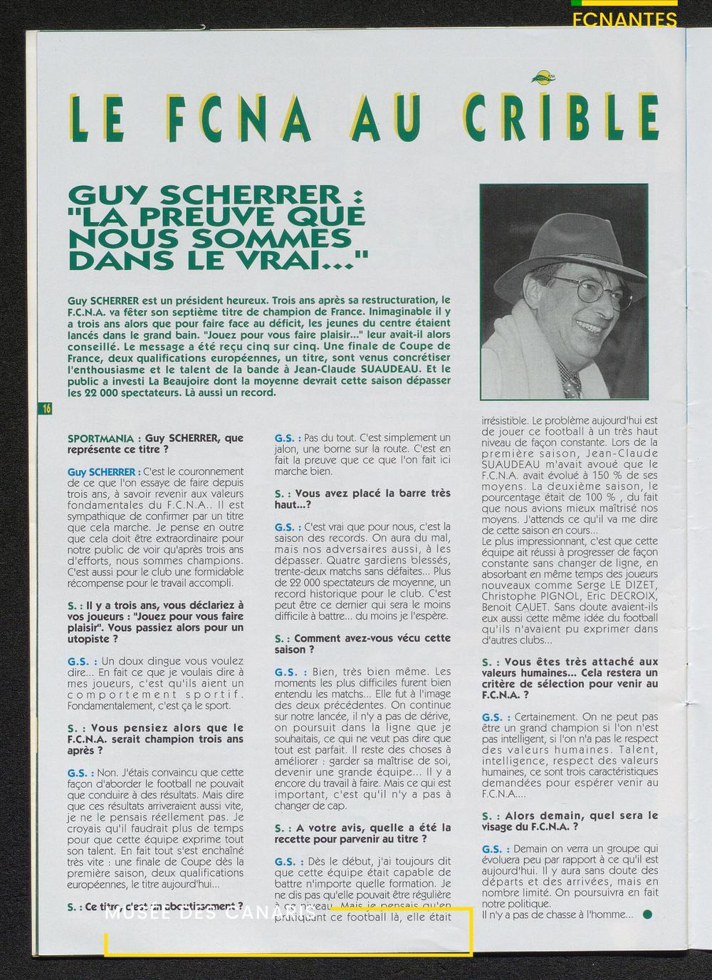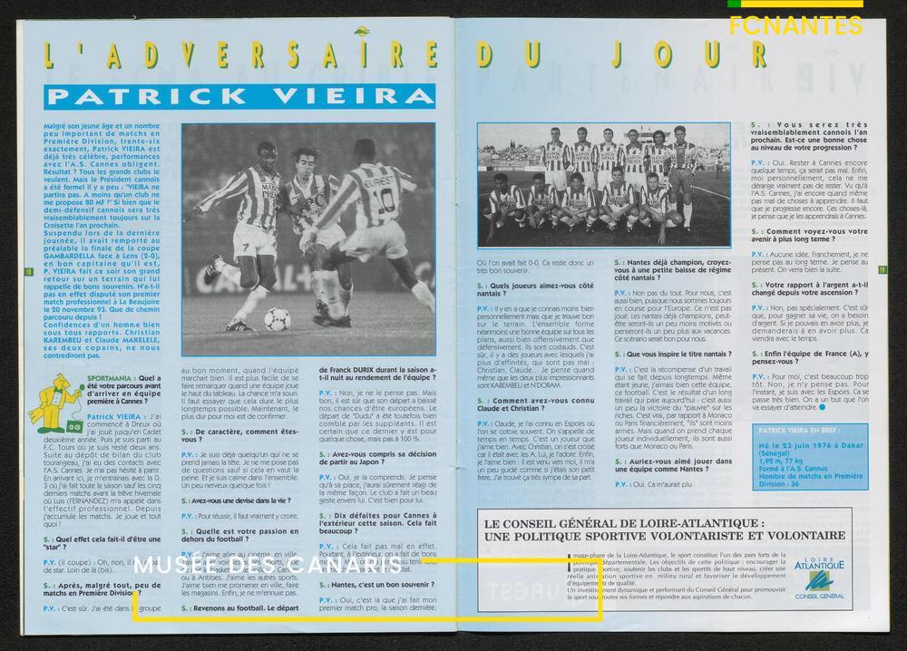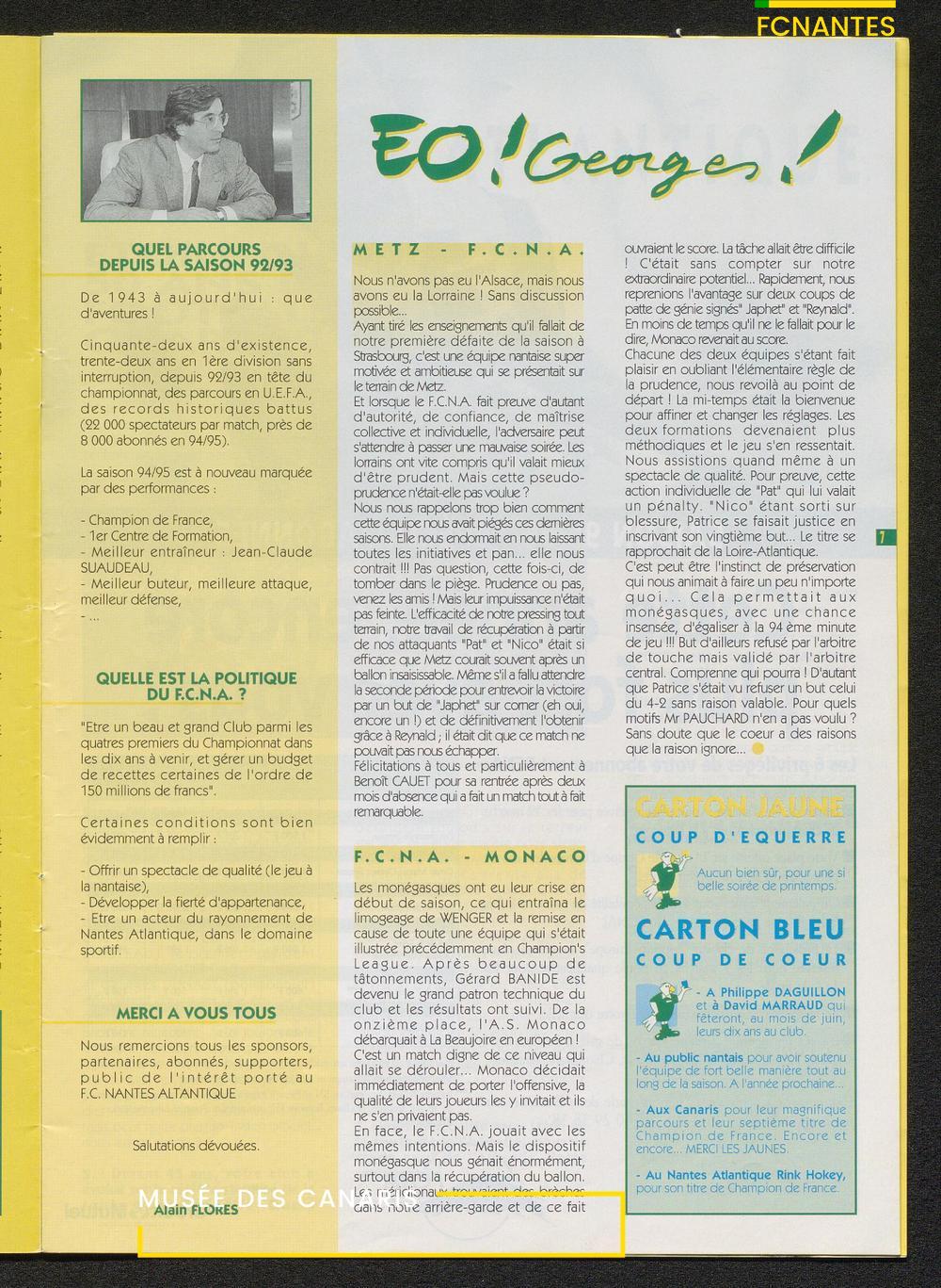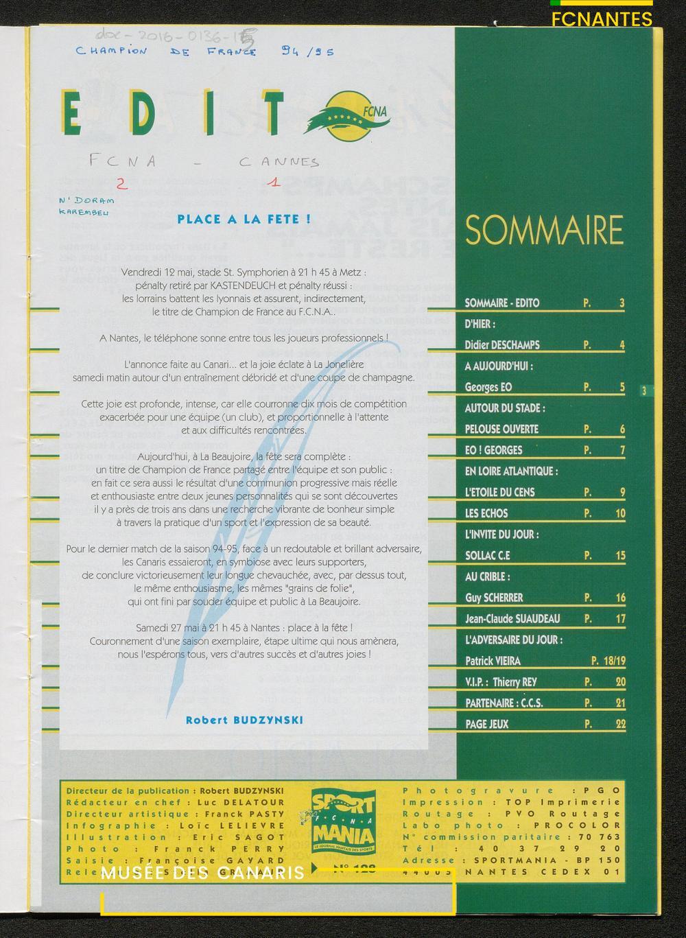 Magazine du Club, avant le match Nantes/Cannes, le samedi 27 mai 1995, n°128 : "Place à la fête !", les Canaris jouent pour fêter leur 7ème étoile, avec des itw de Deschamps, Eo, Scherrer, Suaudeau et Patrick Viera (Cannes).