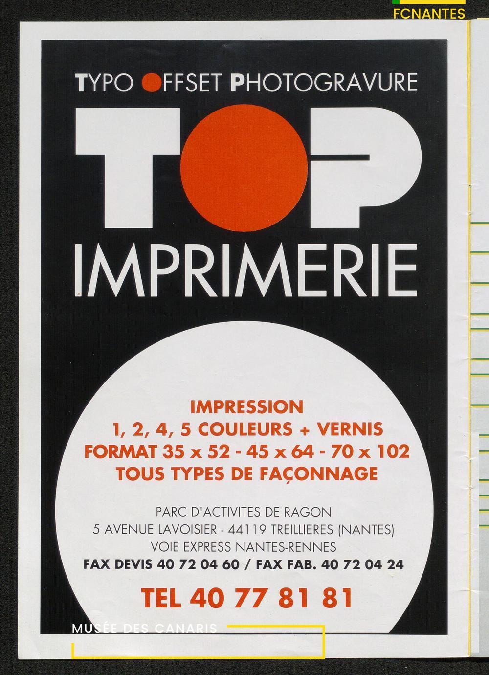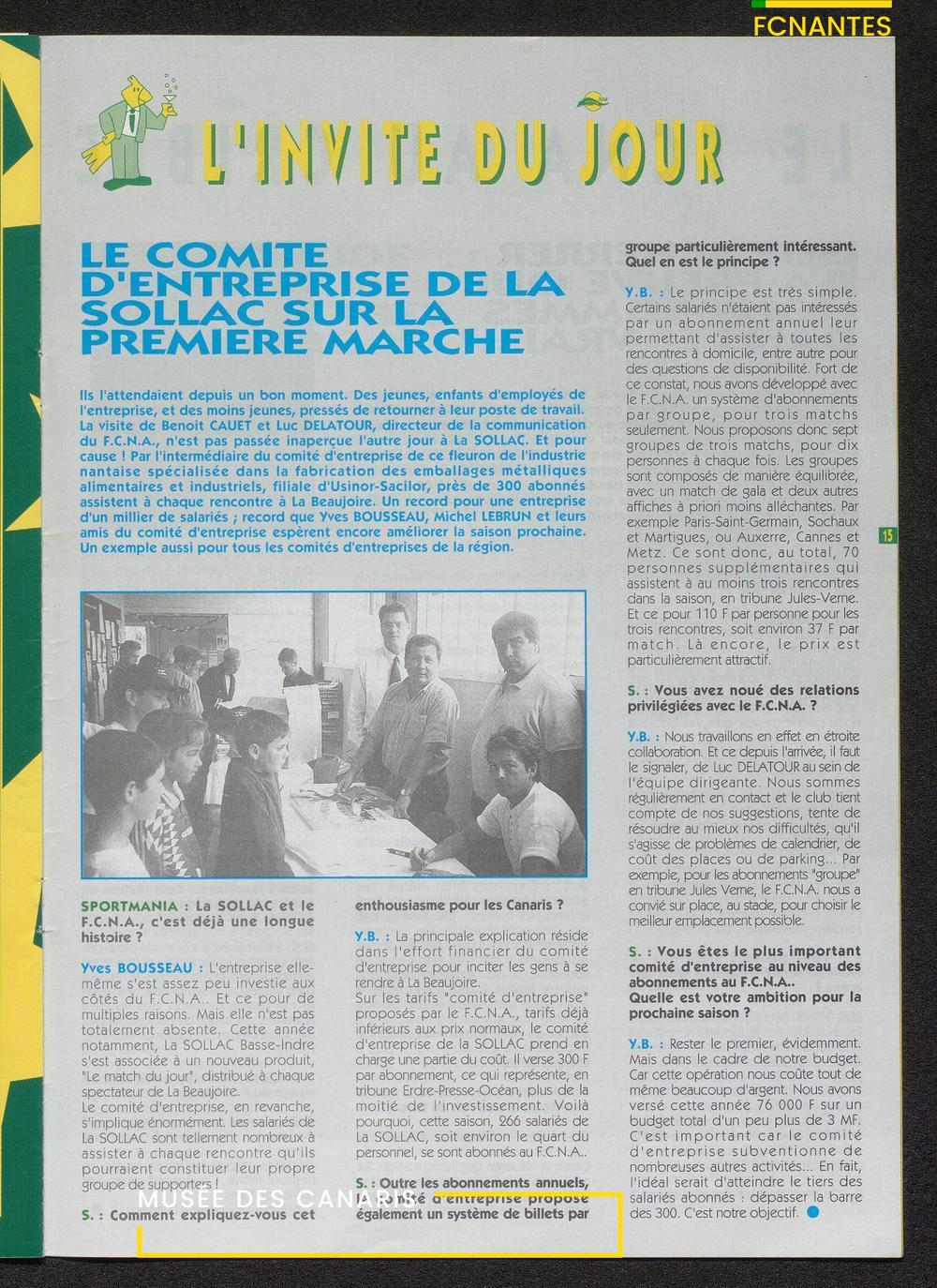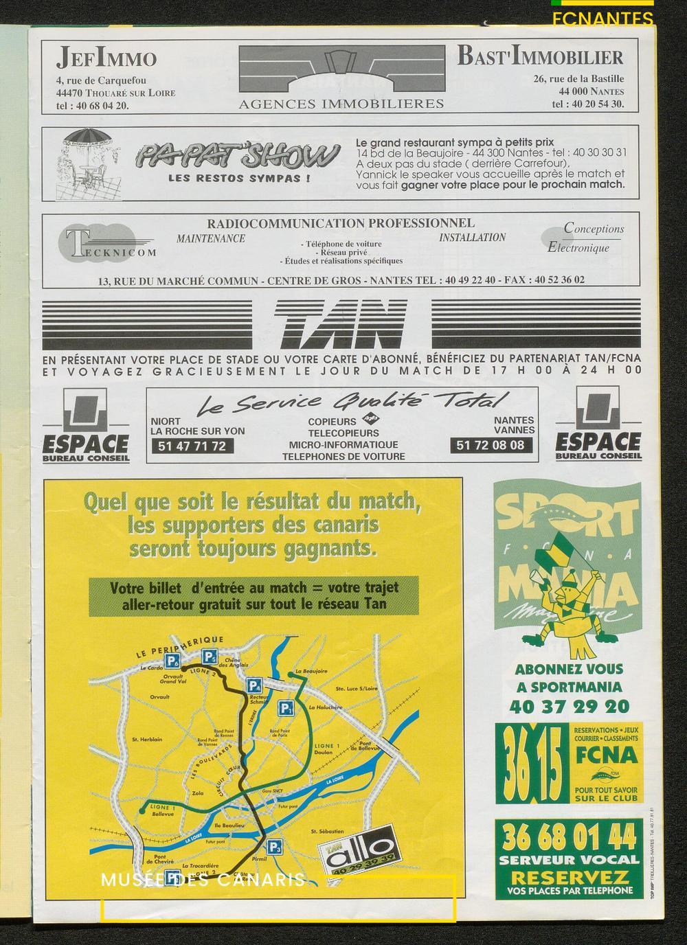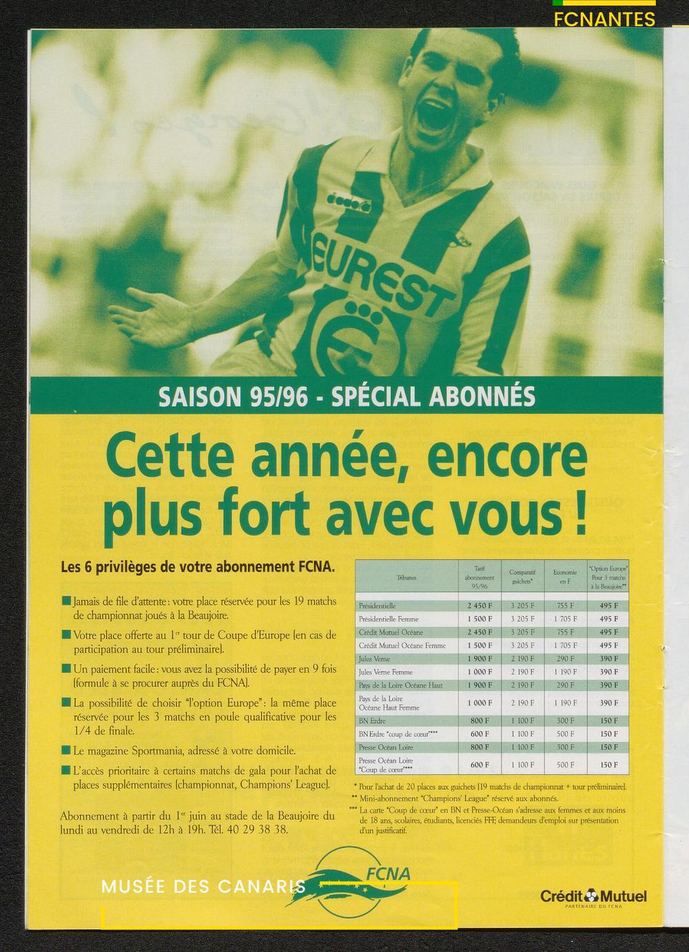 Magazine du Club, avant le match Nantes/Cannes, le samedi 27 mai 1995, n°128 : "Place à la fête !", les Canaris jouent pour fêter leur 7ème étoile, avec des itw de Deschamps, Eo, Scherrer, Suaudeau et Patrick Viera (Cannes).
