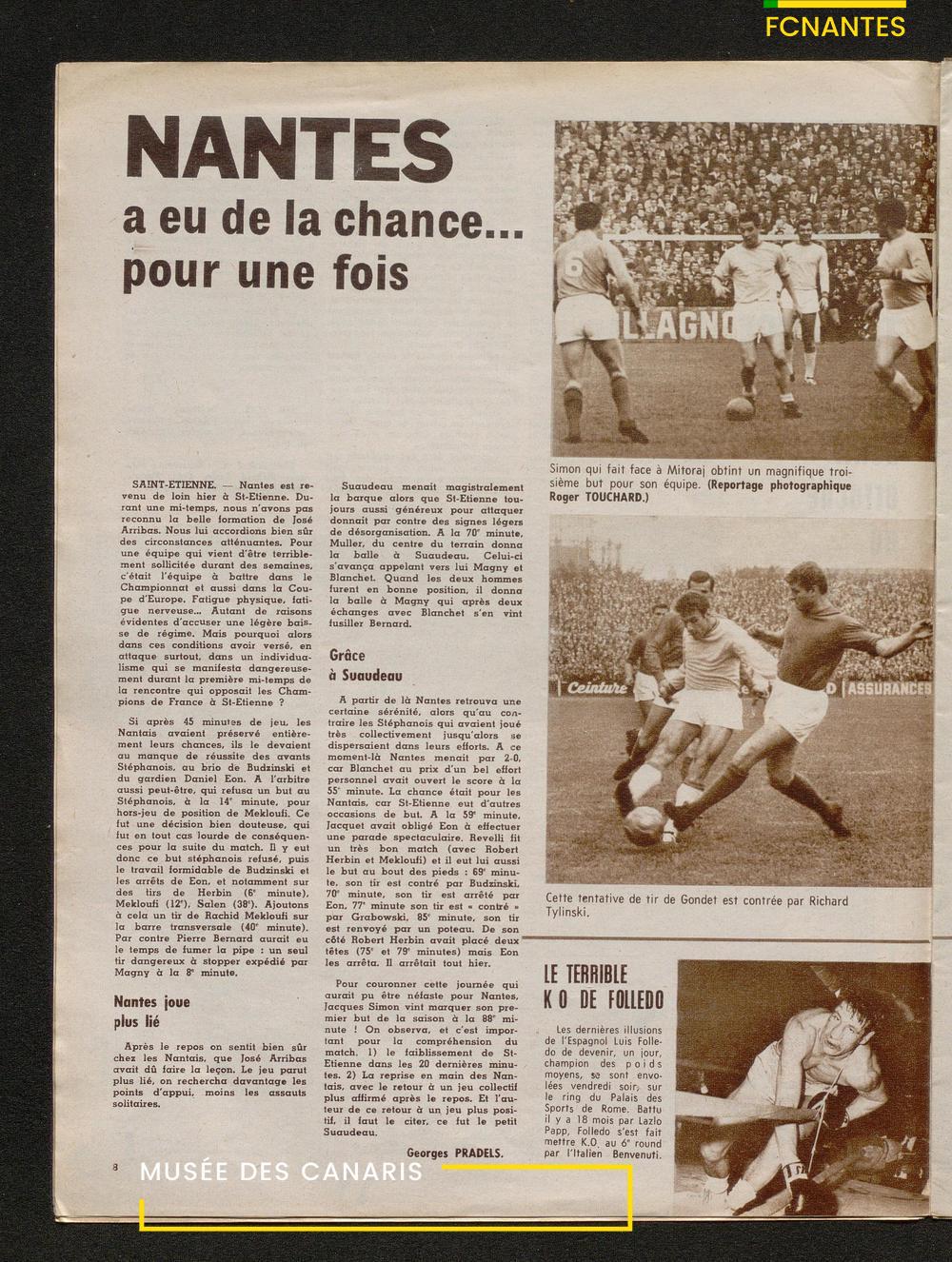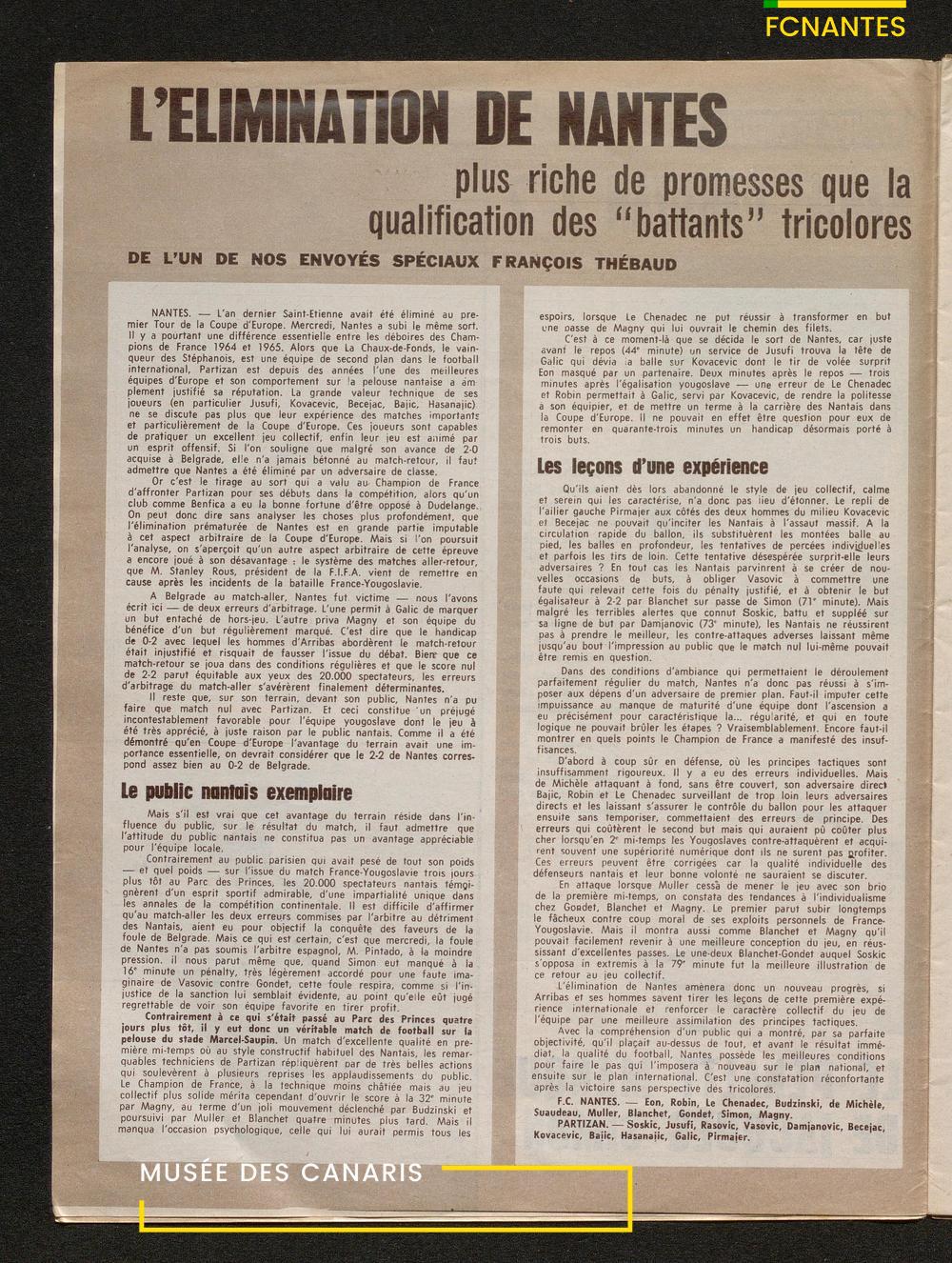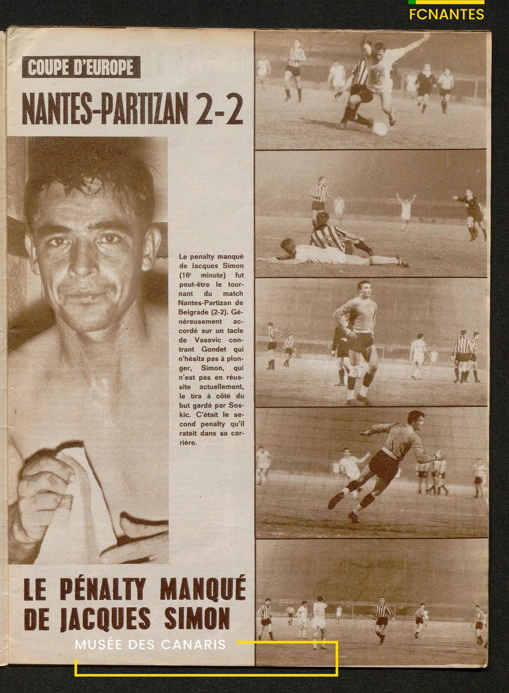 Article en intérieur : Nantes/Partizan 2 à 2 avec le pénalty manqué de Jacky Simon