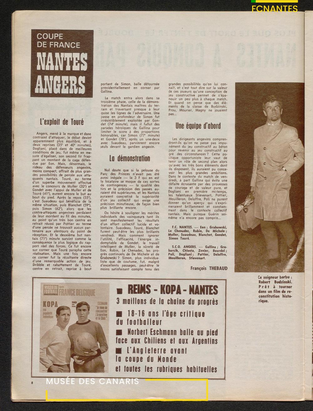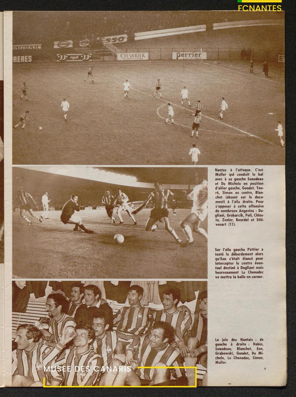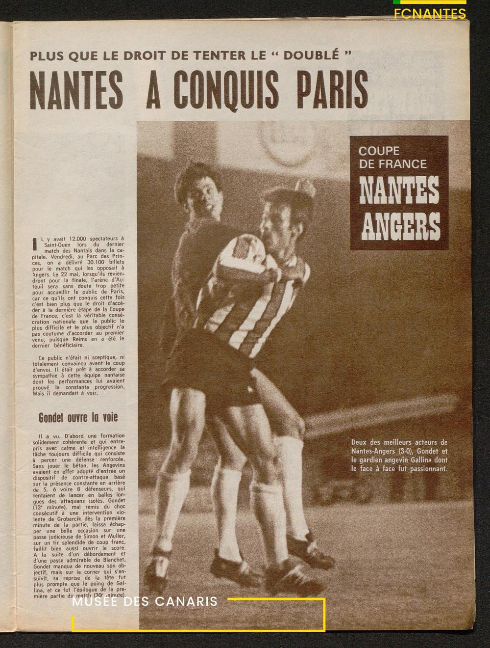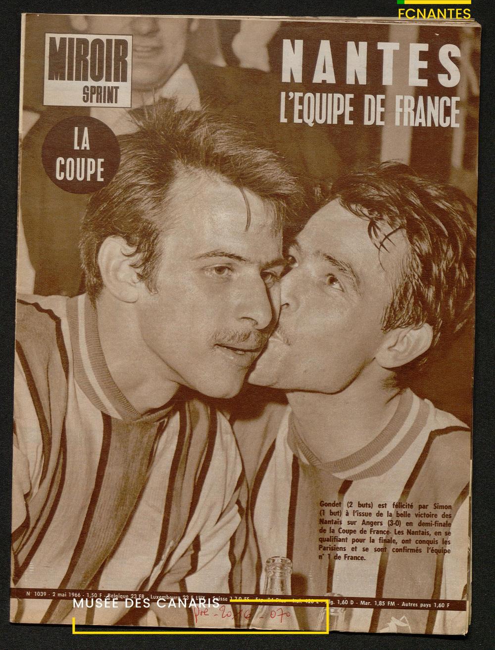 En couverture, Jacky Simon félicite Philippe Gondet après la 1/2 finale de Coupe de France contre Angers, qui qualifie les canaris pour la finale.
