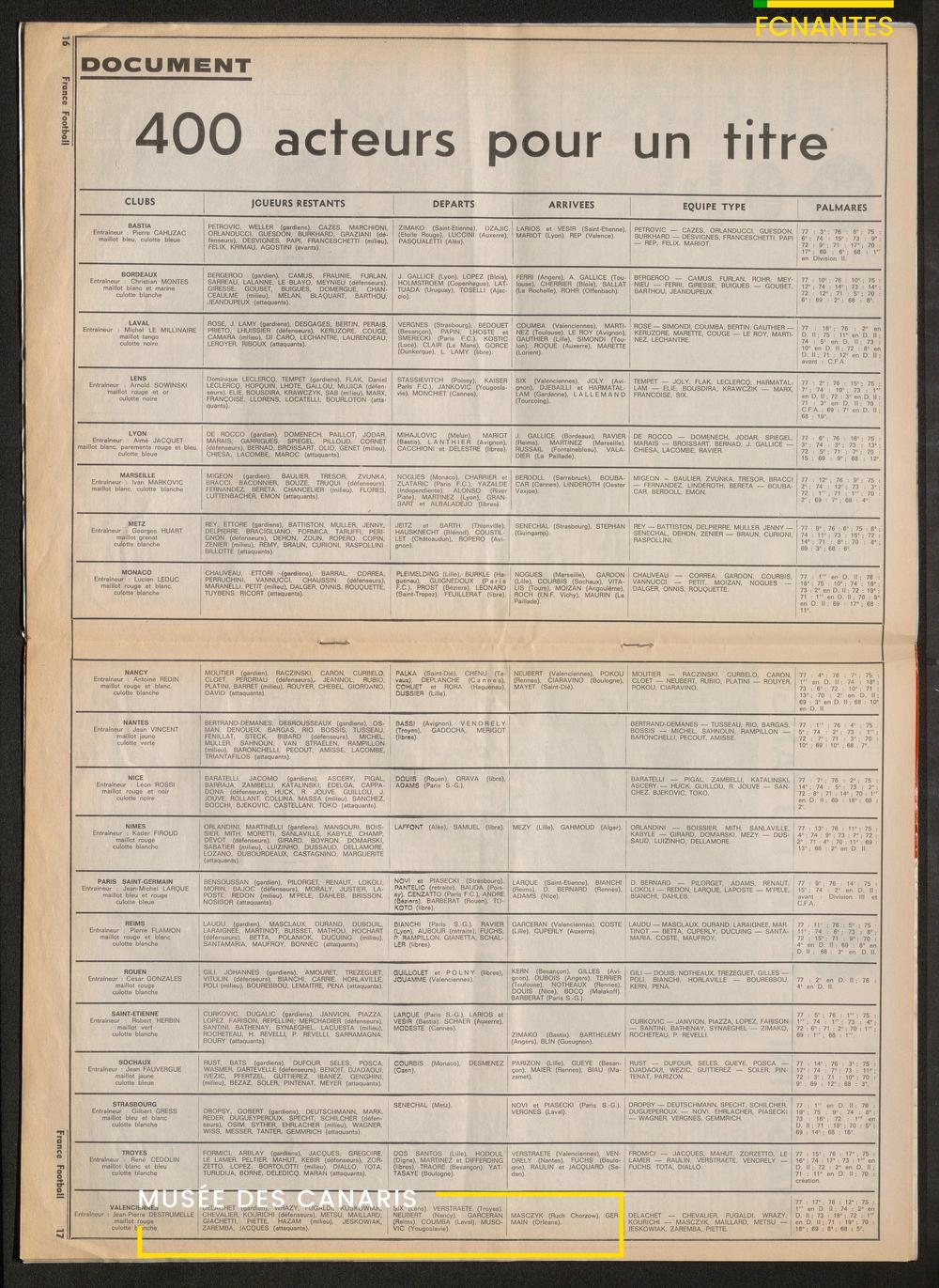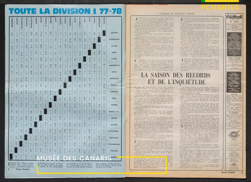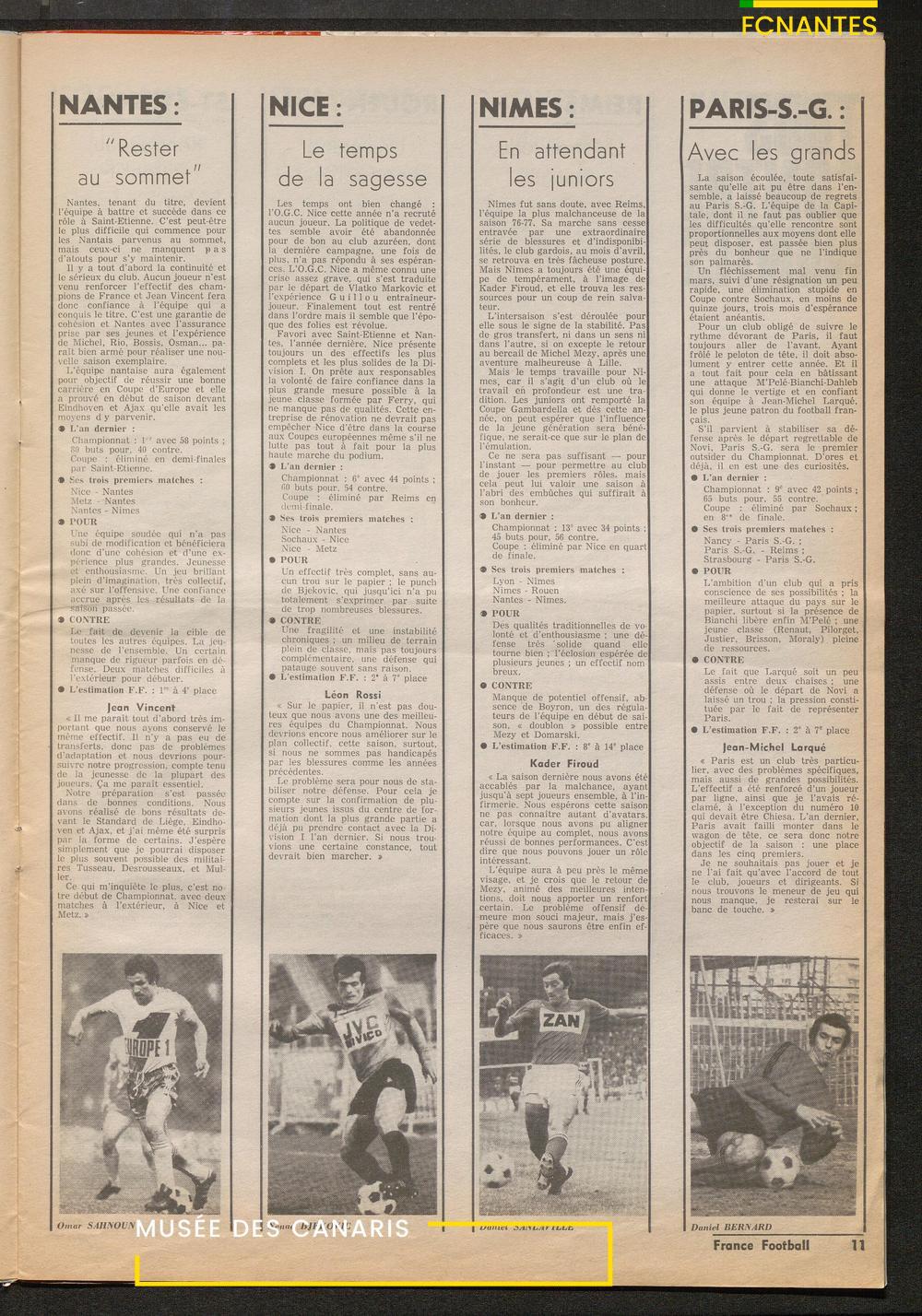 L'hebdomadaire de football écrit sur l'entame du nouveau championnat 1977/1978, avec Henri Michel en couverture et un premier match de gala face à l'OGC Nice, dauphin des Canaris lors du championnat précédent.