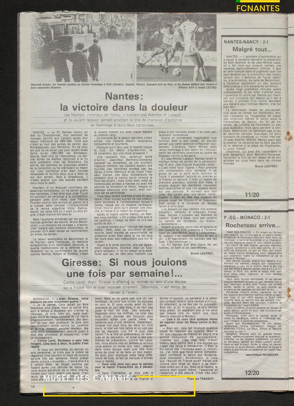Vahid Halilhodzic est en couverture du journal hebdomadaire, pour rappeler que le foot continue après l'accident de Seth Adonkor et Jean Michel Labejof, et que les Nantais se dirigent vers le titre de champions d'automne 1984.