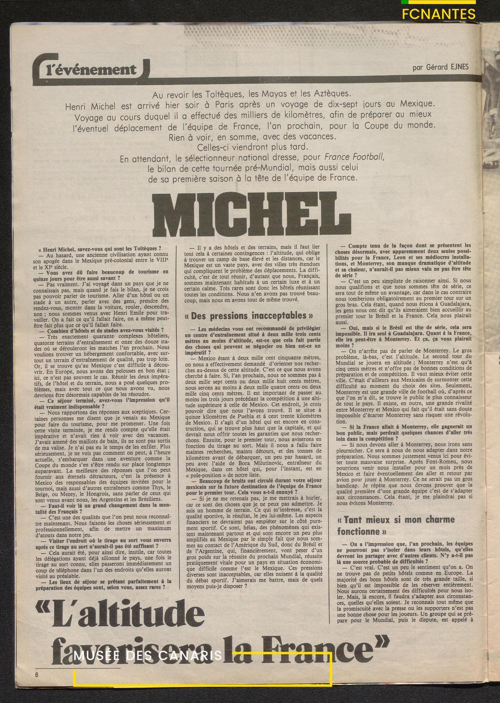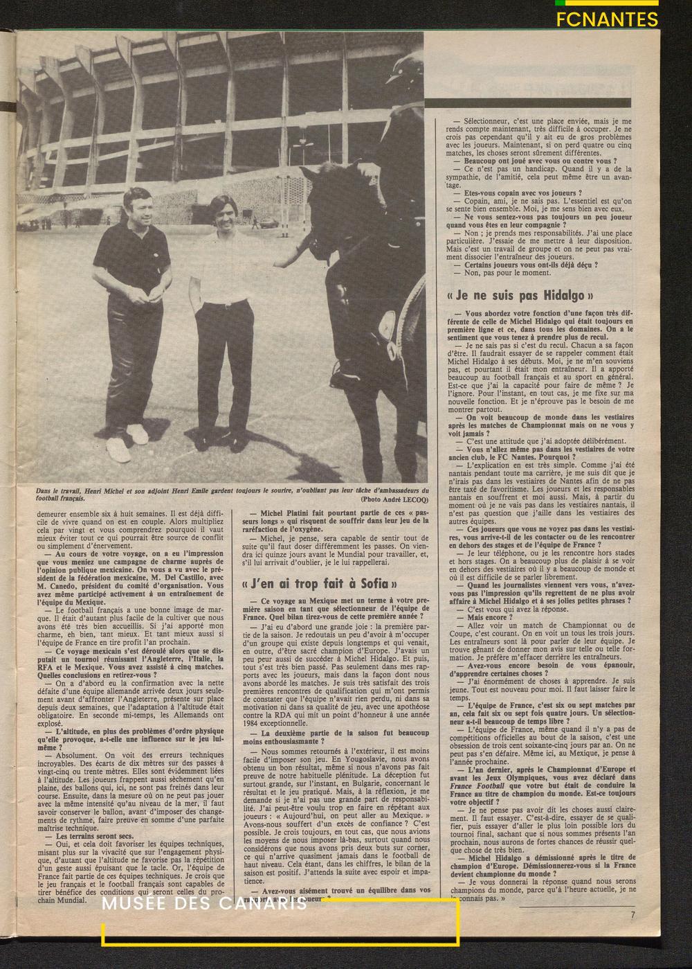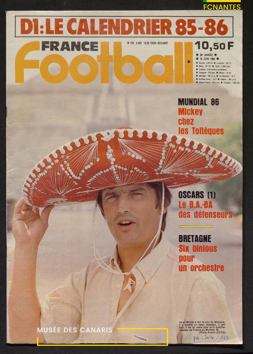 Henri Michel, le sélectionneur de l'Equipe de France, en couverture du France Football : "Mickey chez les Toltèques" avant la coupe du Monde 1986 au Mexique.