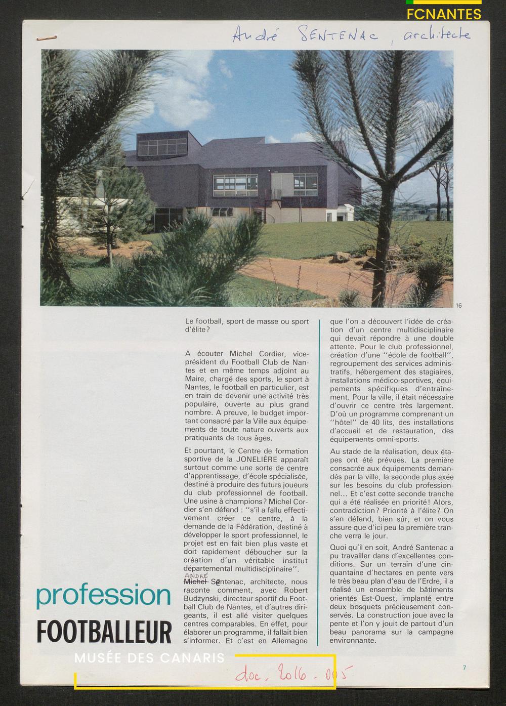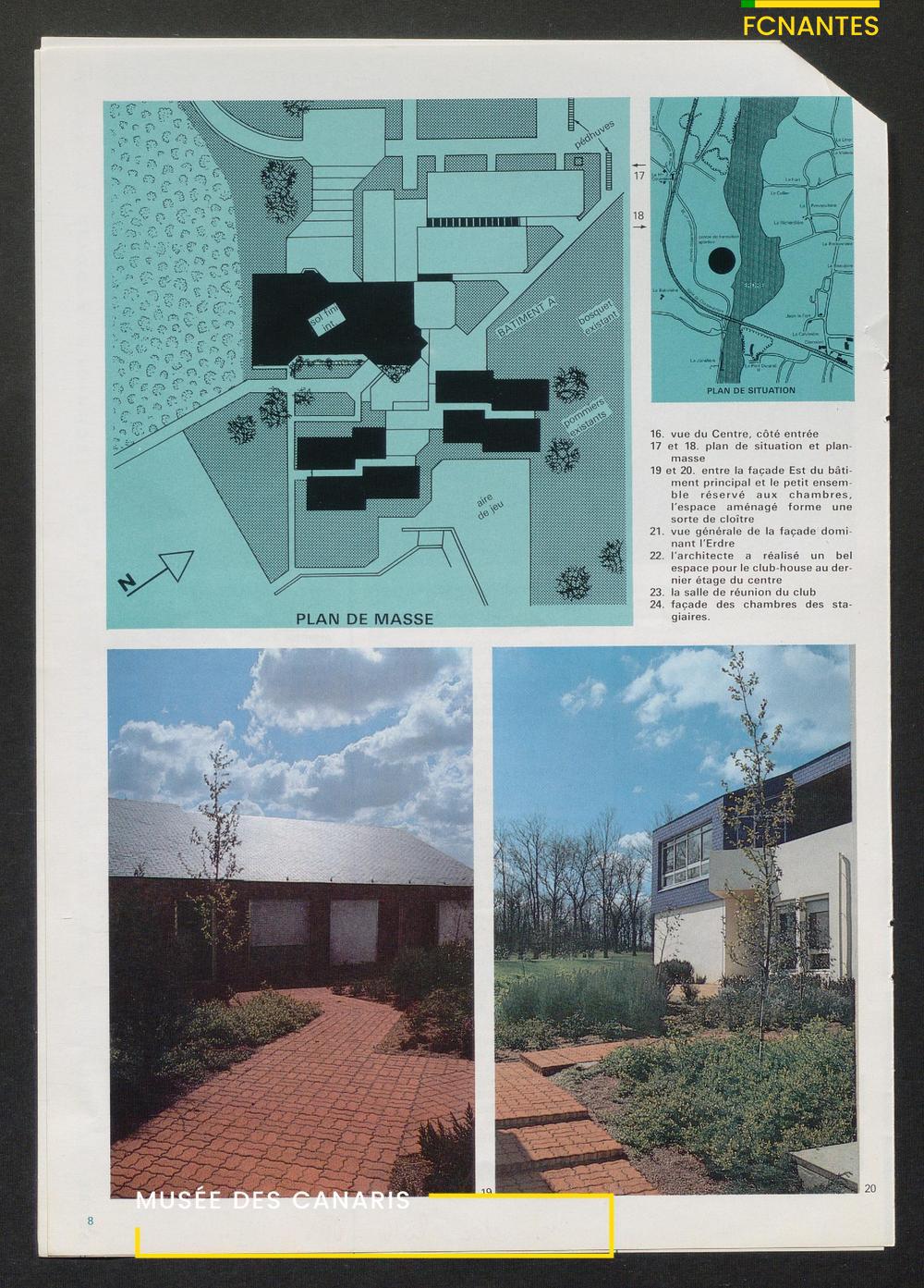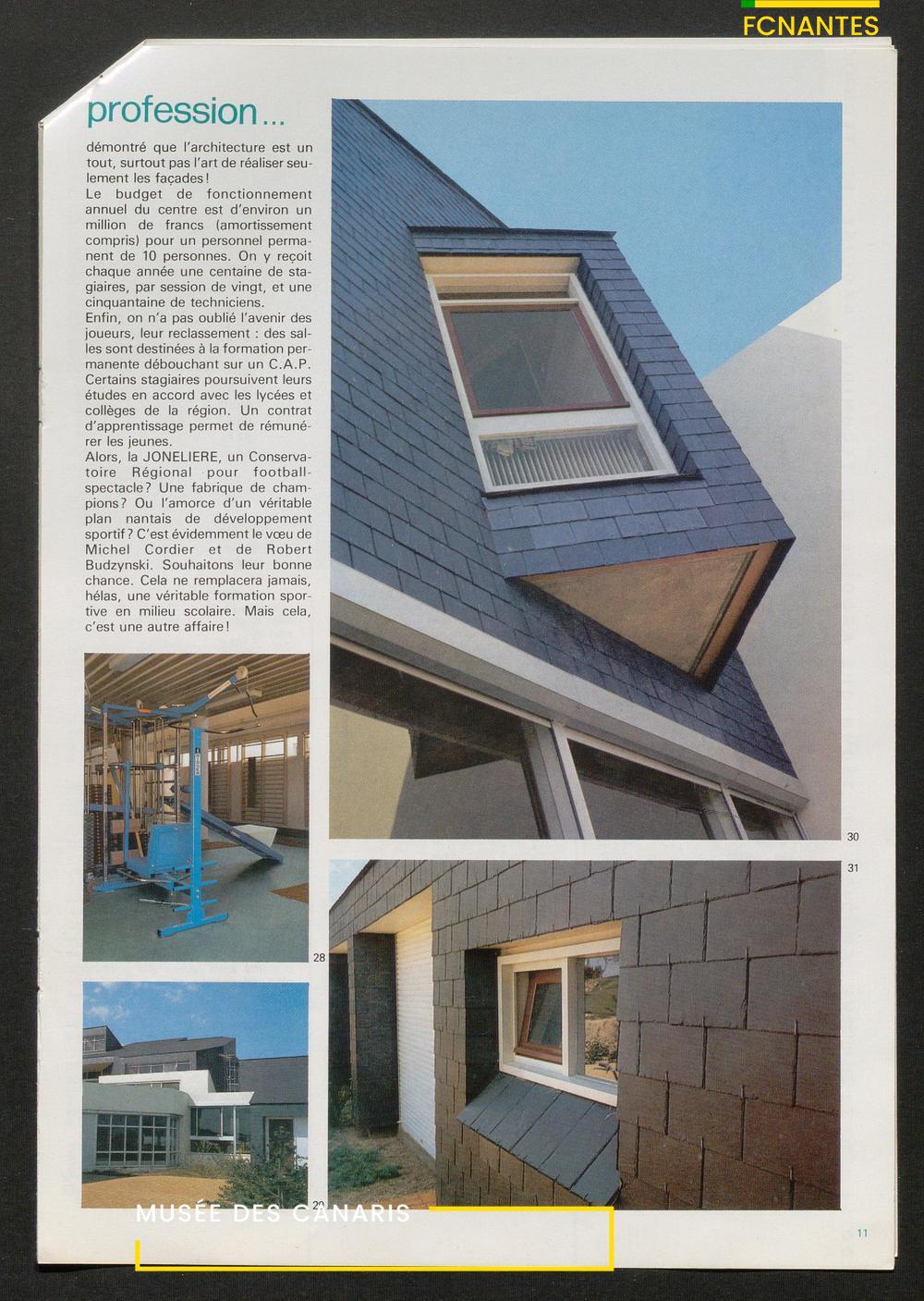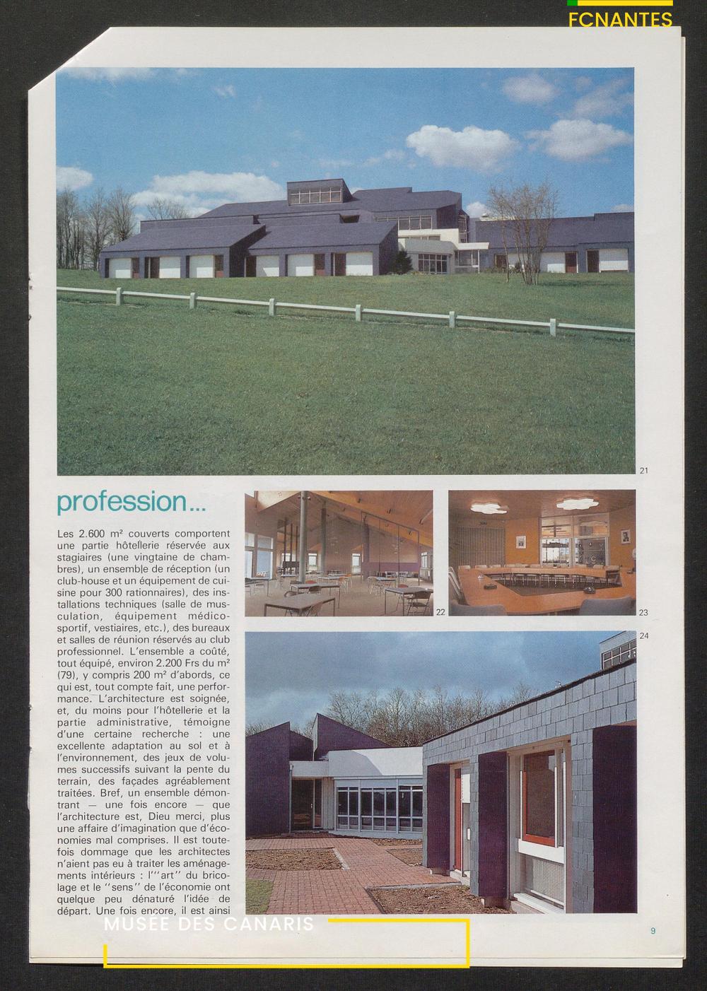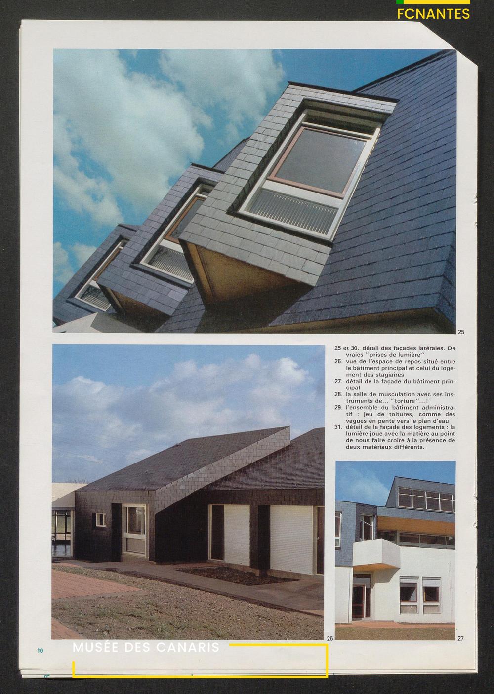 La revue "L'Aluminium" présente des constructions modernes, en alu et ardoise, tel que le Centre sportif de La Jonelière. Cet article interroge André Sentenac, l'architecte du tout nouveau siège du FC Nantes.
