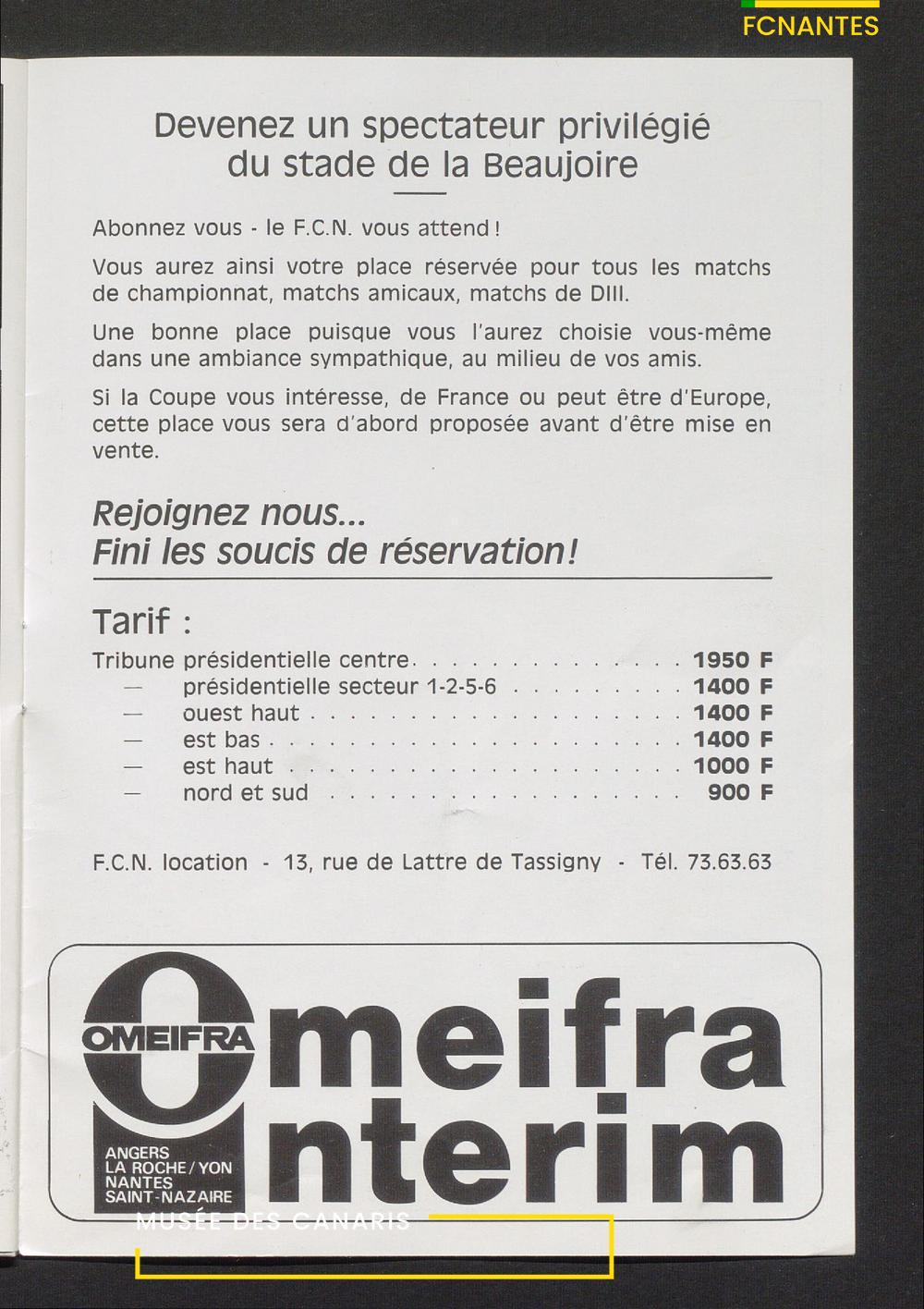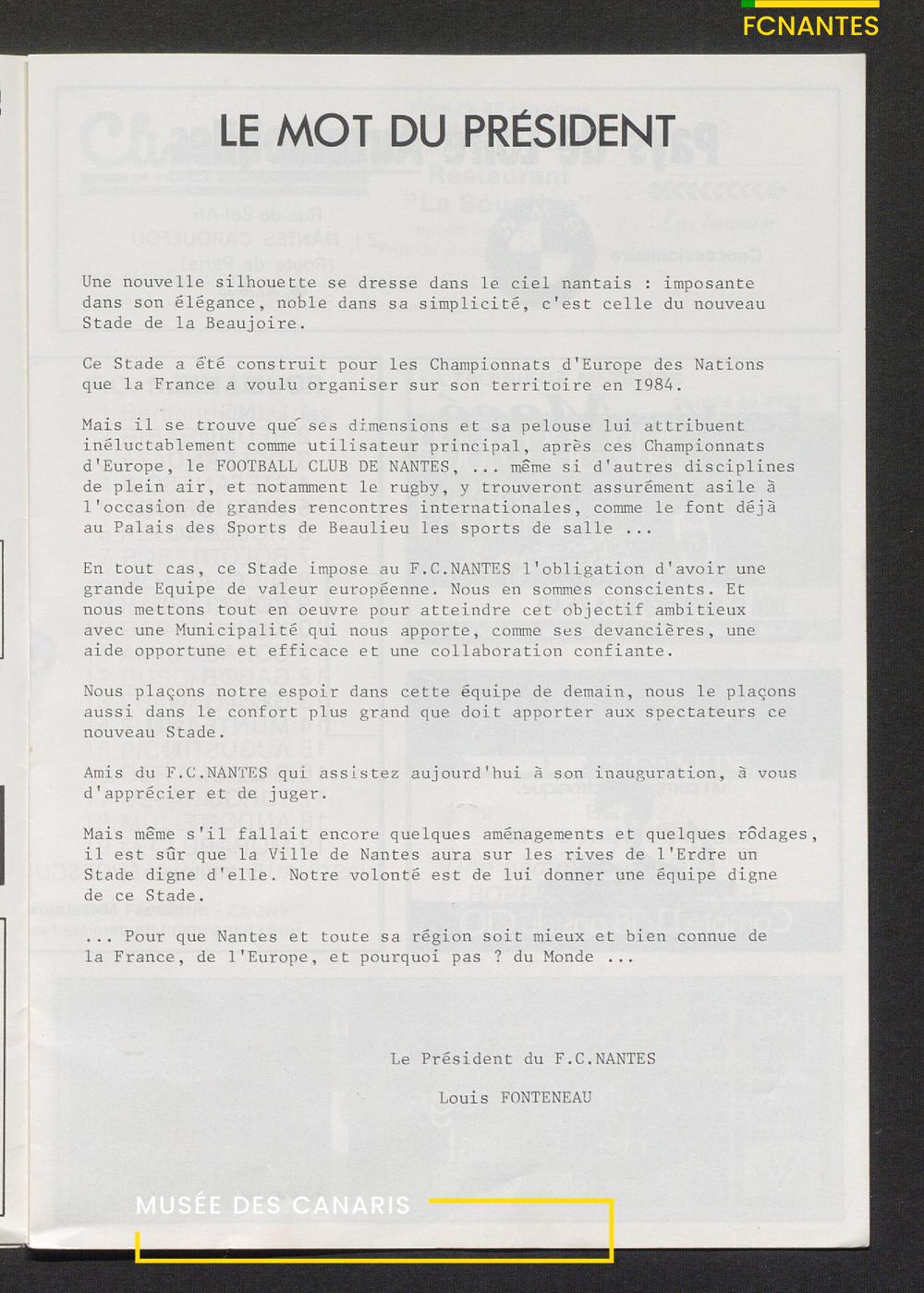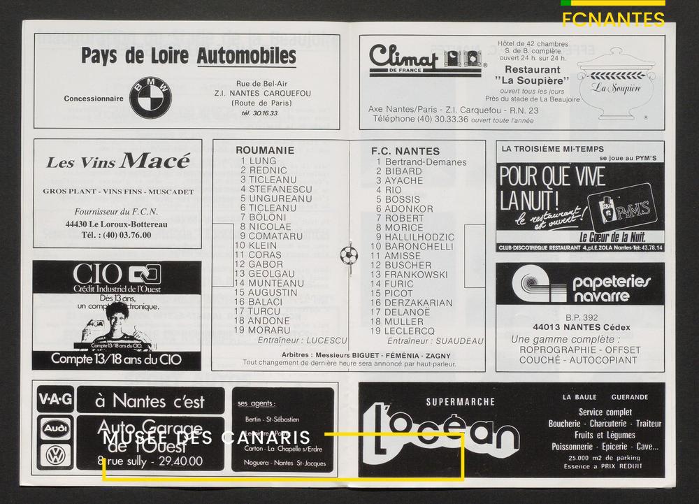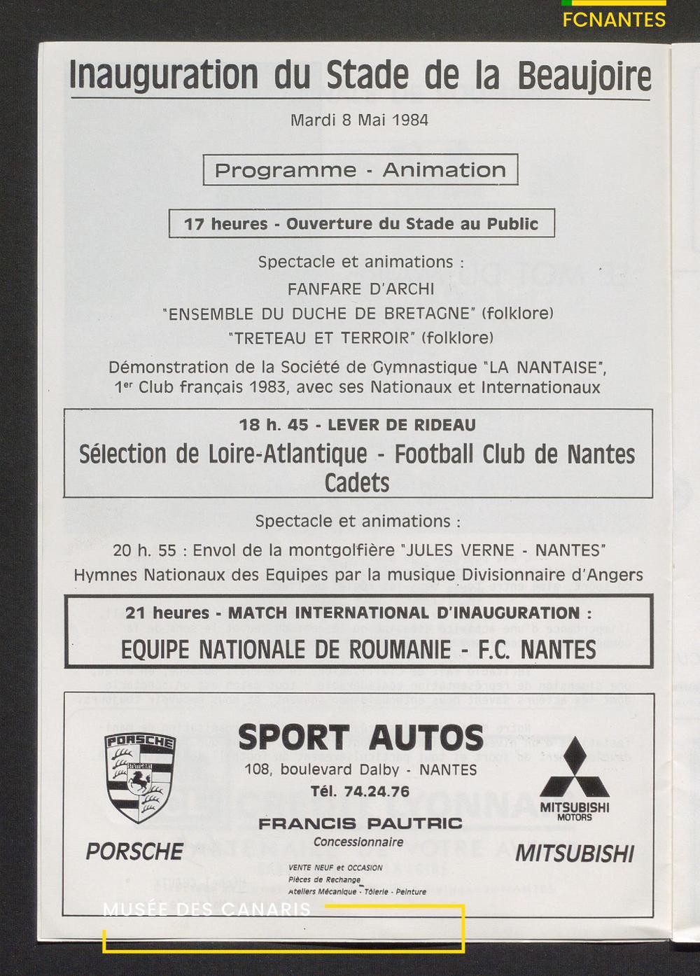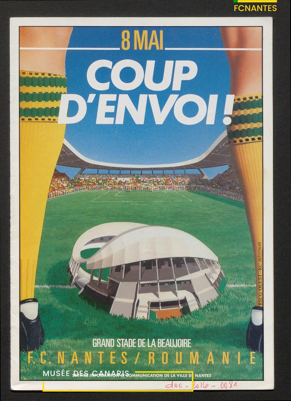 Le service communication de la ville de Nantes sort un imprimé pour l'inauguration du stade de La Beaujoire et le coup d'envoi des matches, avec un match face à l'équipe nationale de la Roumanie.